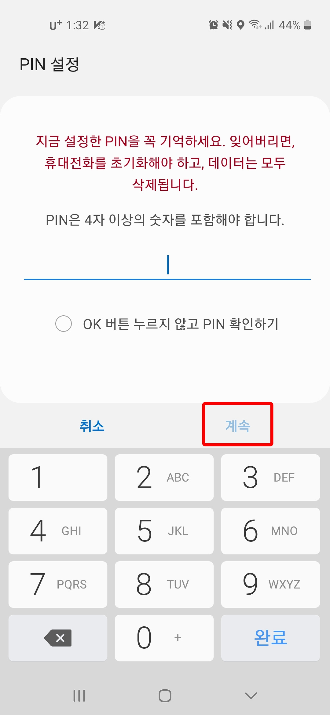 2. 4자 이상의 숫자를 입력하고 "계속" 버튼을 누릅니다.