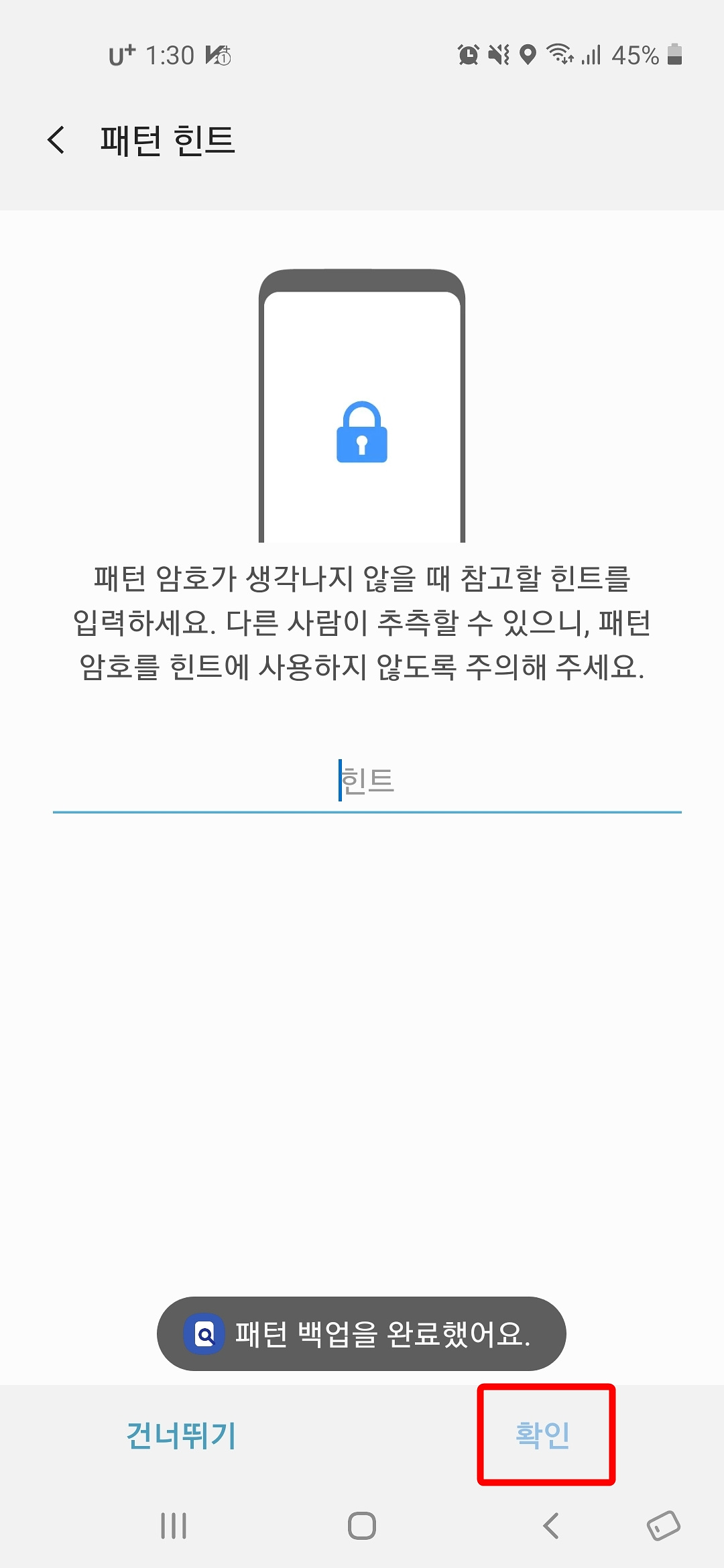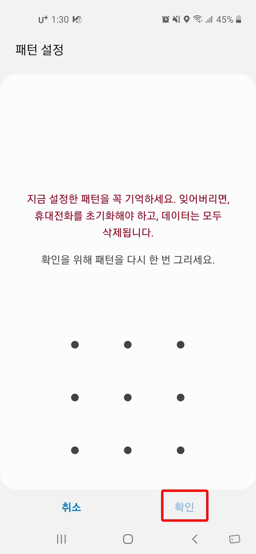 3. 확인을 위해 패턴을 다시 한번 그리고 "확인" 버튼을 누릅니다.