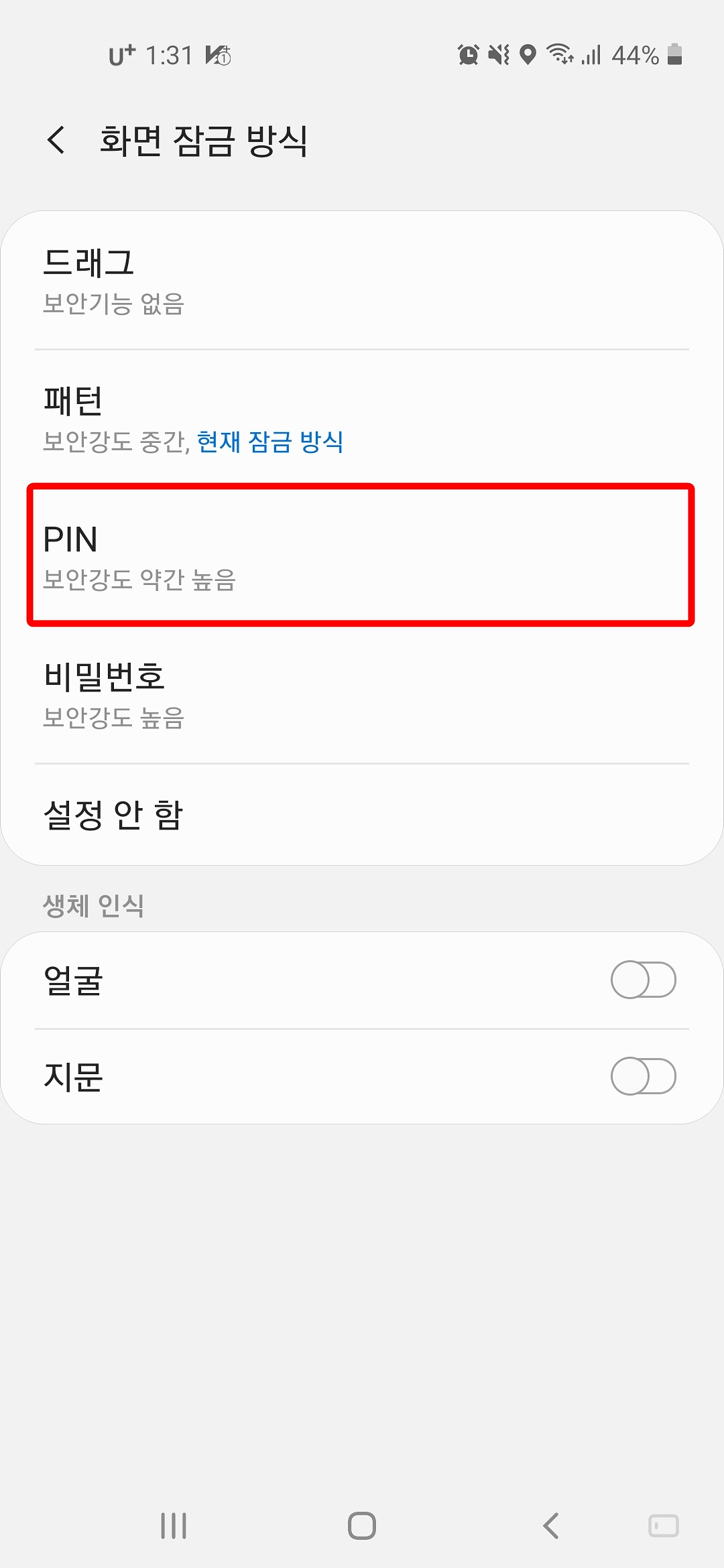 1. 보안강도가 약간 높은 "PIN"을 누릅니다.