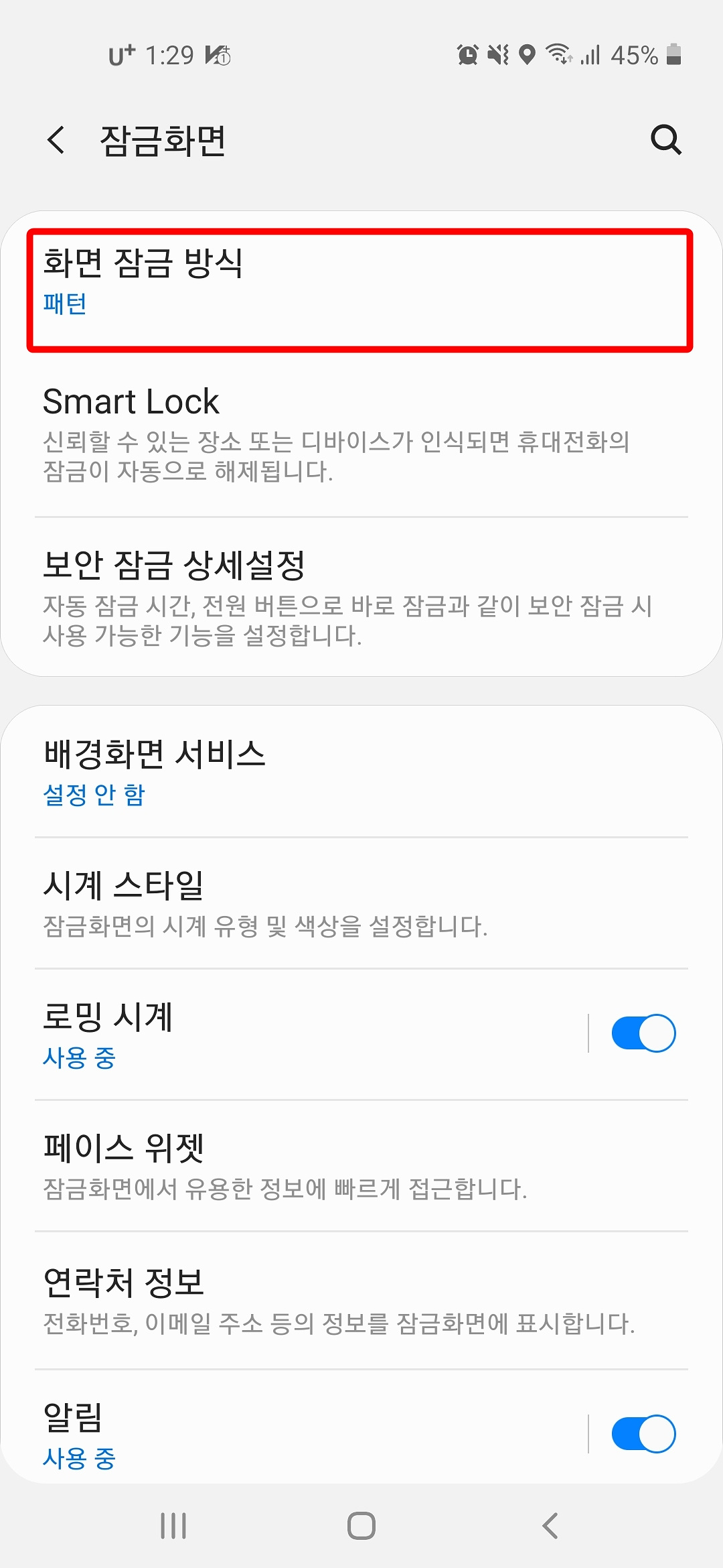 3. "화면 잠금 방식"을 클릭합니다. 저는 잠금화면을 패턴으로 설정해 놓아서 현재 패턴을 그리면 화면 잠금 방식 화면으로 넘어갑니다.