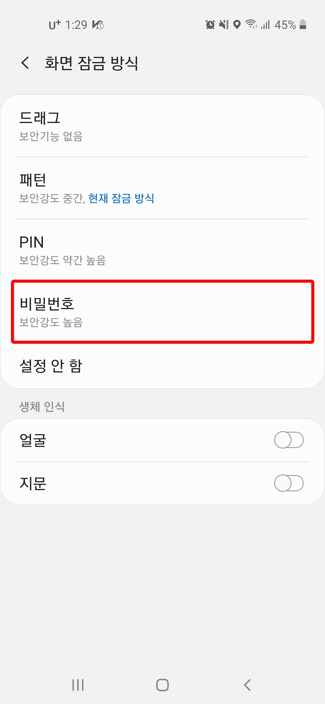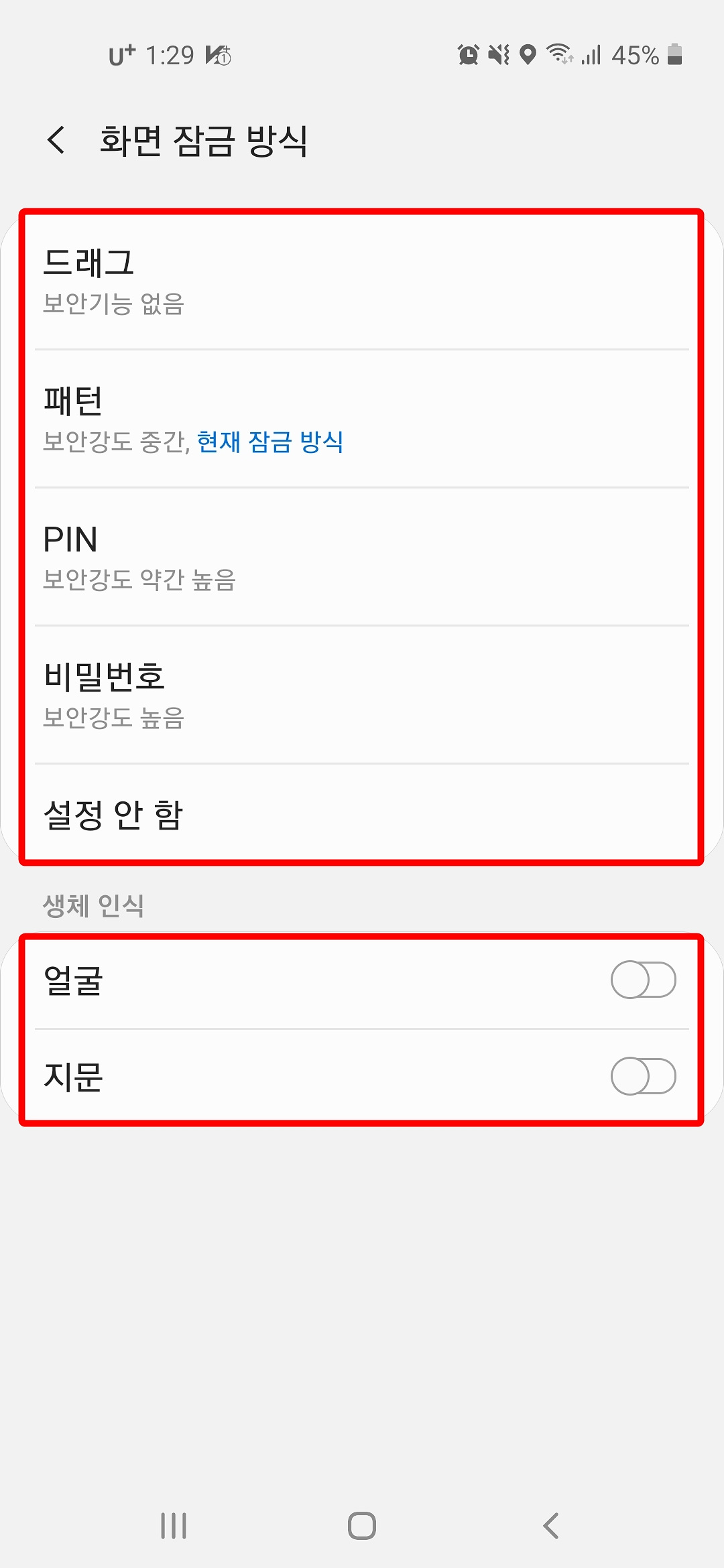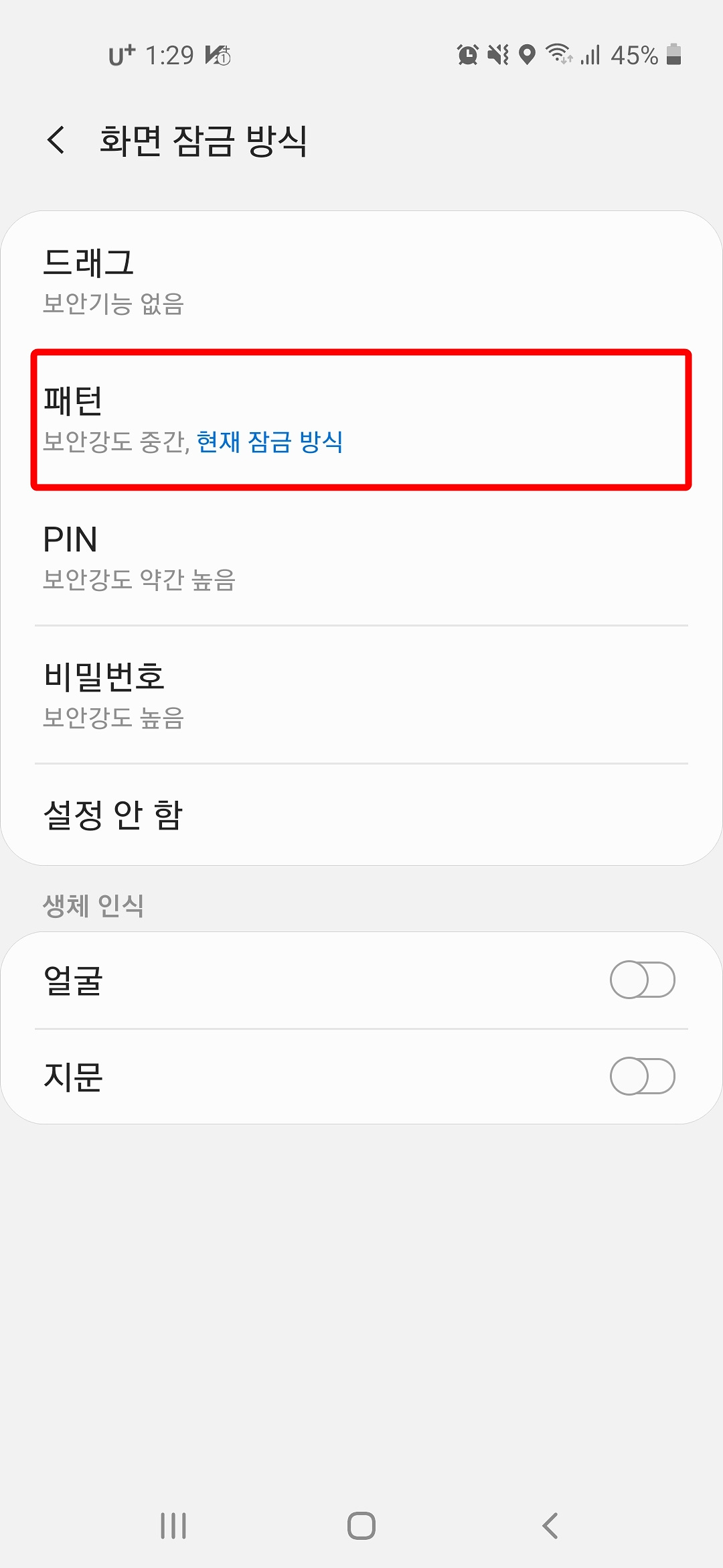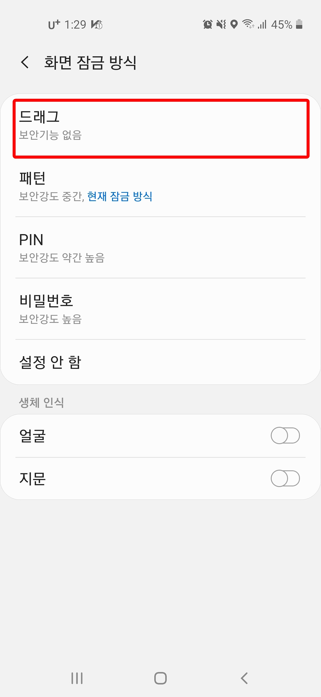 4. 화면 잠금 방식에는 드래그, 패턴, PIN, 비밀번호, 설정 안 함과 생체 인식으로는 얼굴, 지문 잠금 방식이 있는데요.