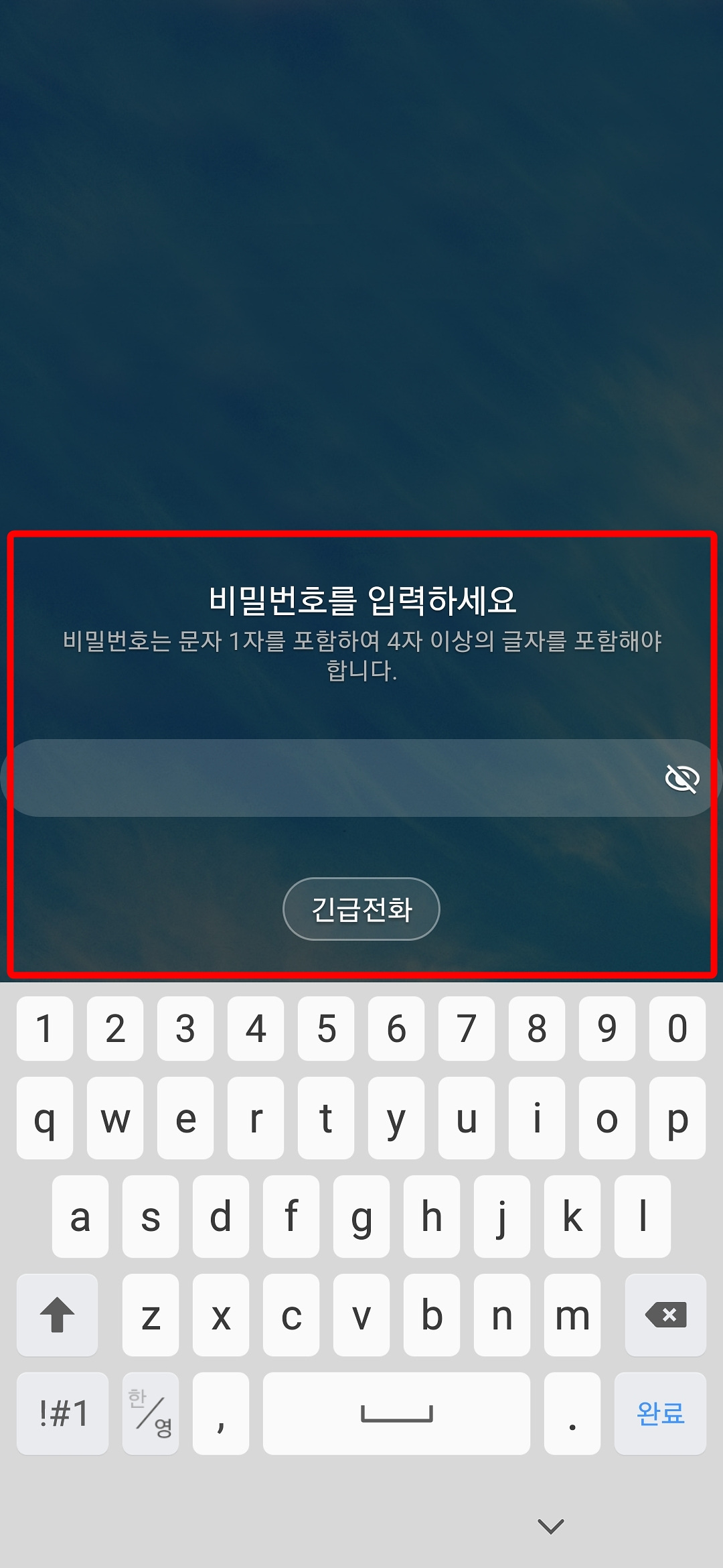 1. 1자 이상의 문자를 포함하는 4자 이상의 문자 또는 숫자를 입력하여 잠금 하는 방식입니다.