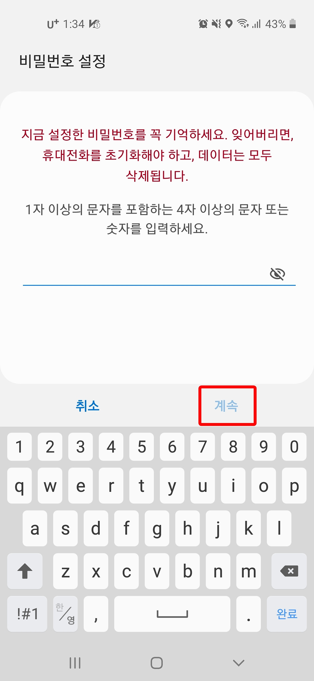 2. 1자 이상의 문자를 포함하는 4자 이상의 문자 또는 숫자를 입력하고 "계속" 버튼을 누릅니다.