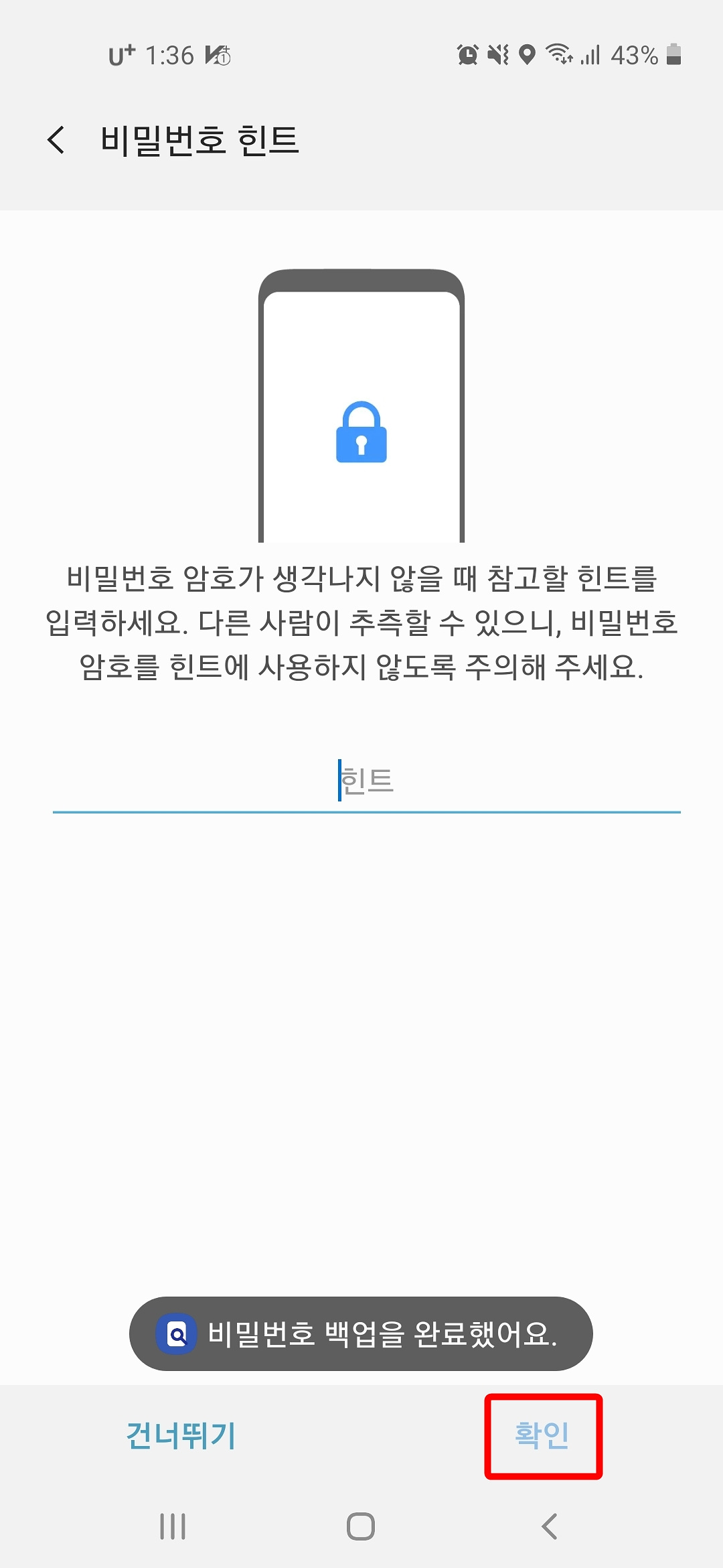 4. 비밀번호 힌트를 입력하고 "확인" 버튼을 누릅니다.