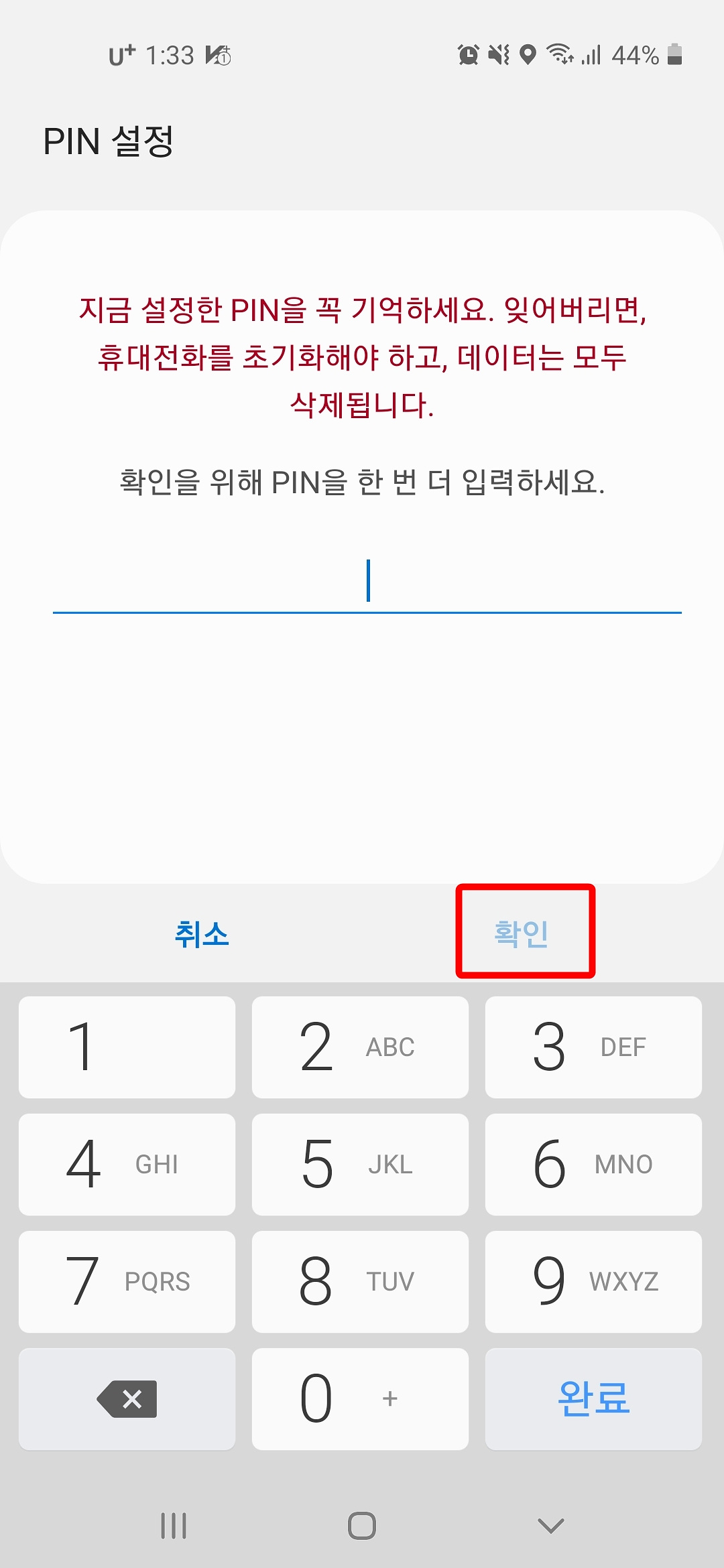 3. 핀 숫자를 한 번 더 입력하고 "확인" 버튼을 누릅니다.
