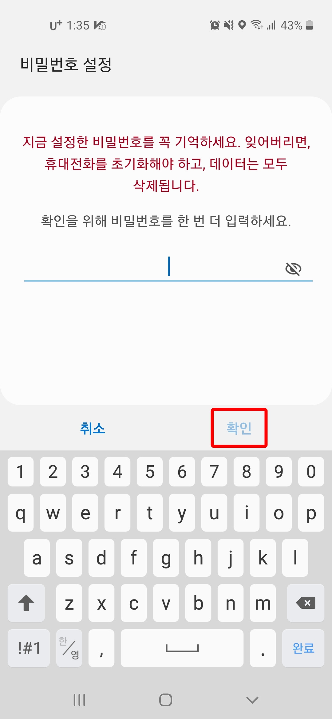 3. 확인을 위해 비밀번호 한 번 더 입력하고 "확인" 버튼을 누릅니다.