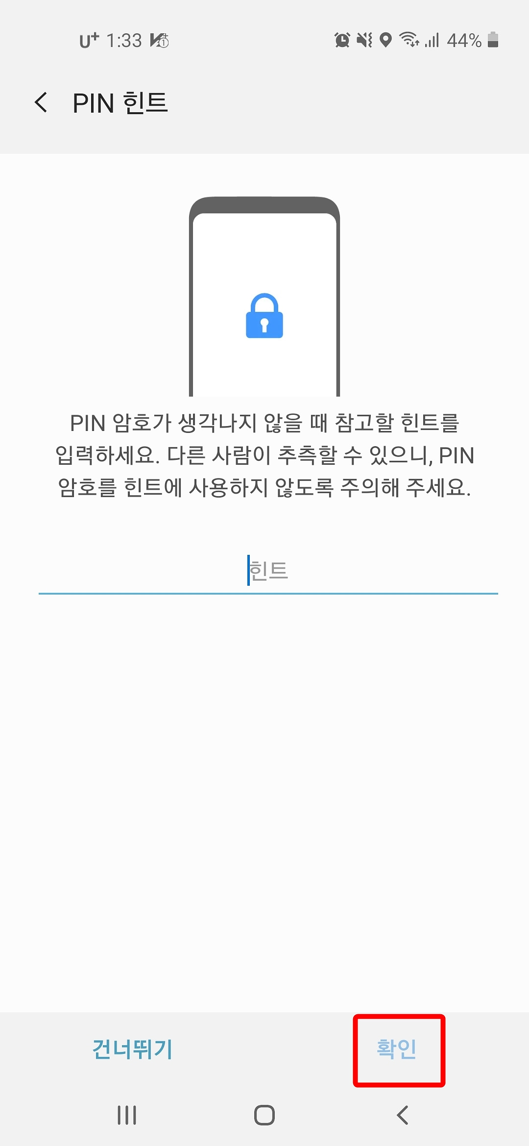 4. 핀 힌트를 입력하고 "확인" 버튼을 누릅니다.