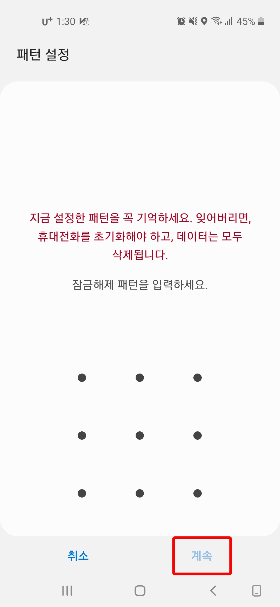 2. 잠금해제 패턴을 입력하고 "계속" 버튼을 누릅니다.