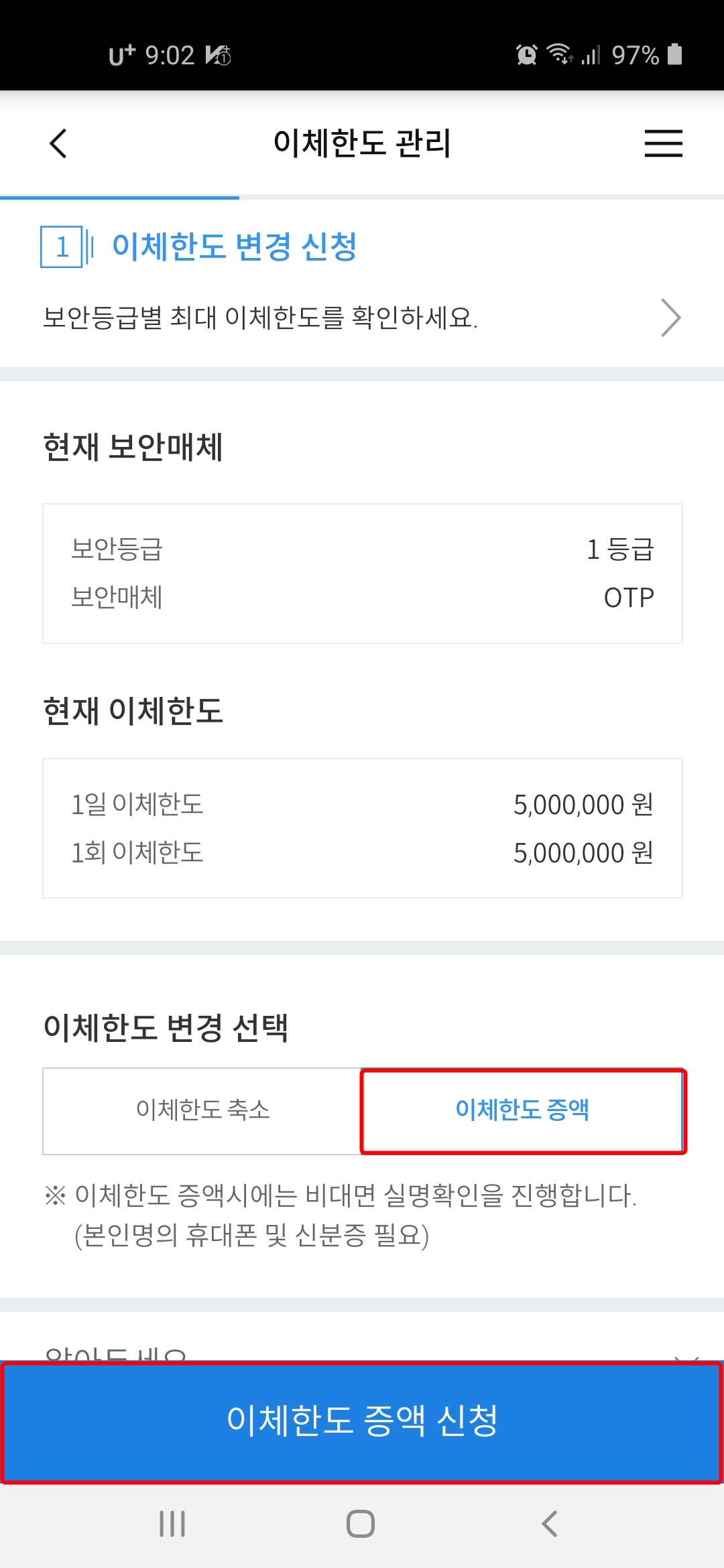 6. 1회 1억원, 1일 5억원을 설정하시려면 OTP를 설치하셔야 하는데요. 저는 현재 설치가 되어 있어서 바로 증액 신청이 가능한데요.