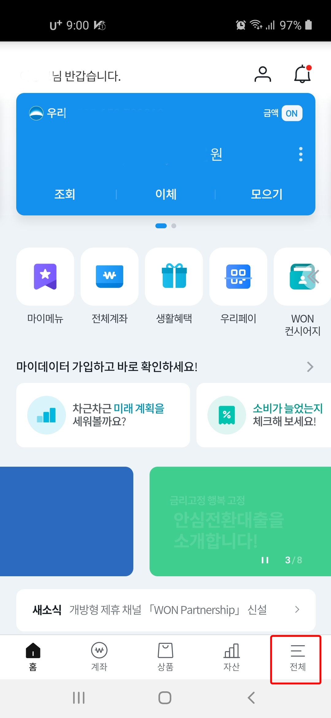 1. 우리WON 뱅킹 앱을 열어 로그인 합니다.