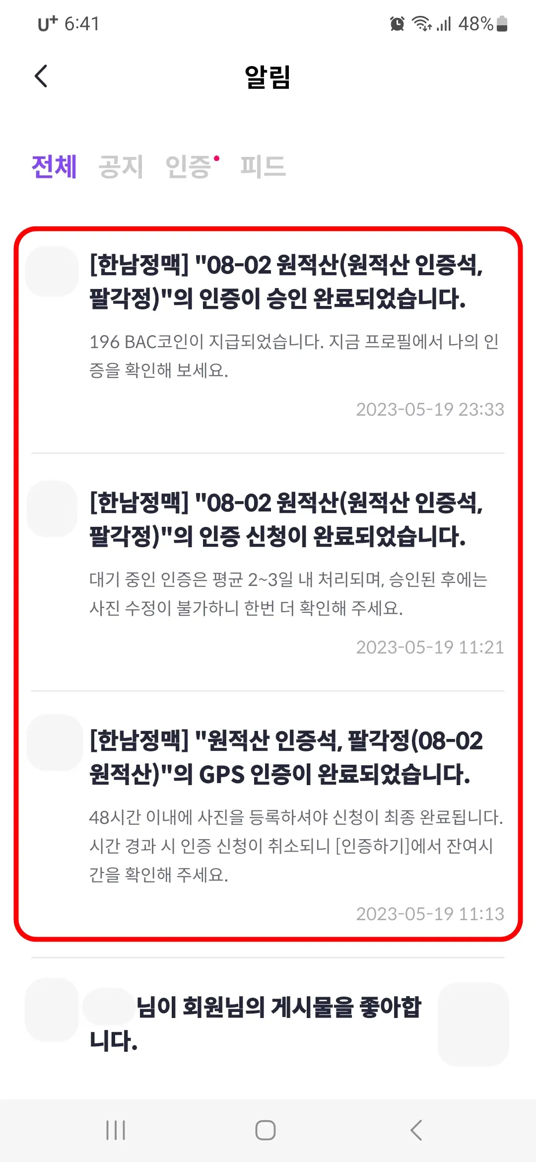 2. 알림창에 GPS 인증, 사진 첨부 후 인증신청 완료, 인증이 최종 승인 완료된 것을 확인할 수 있습니다.