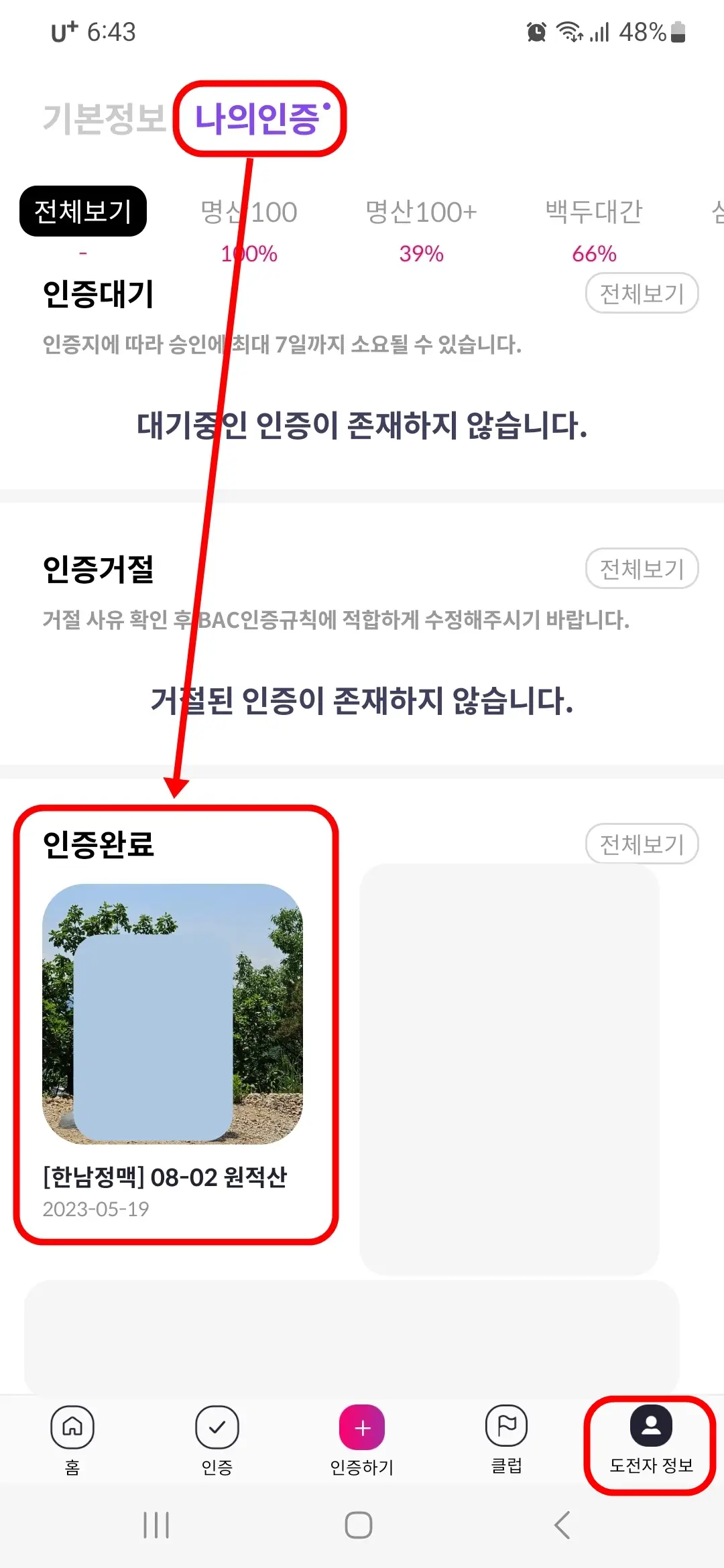 4. 도전자 정보 > 나의 인증을 누르면 "인증대기"에서 "인증완료"로 변경된 것을 확인할 수 있습니다.