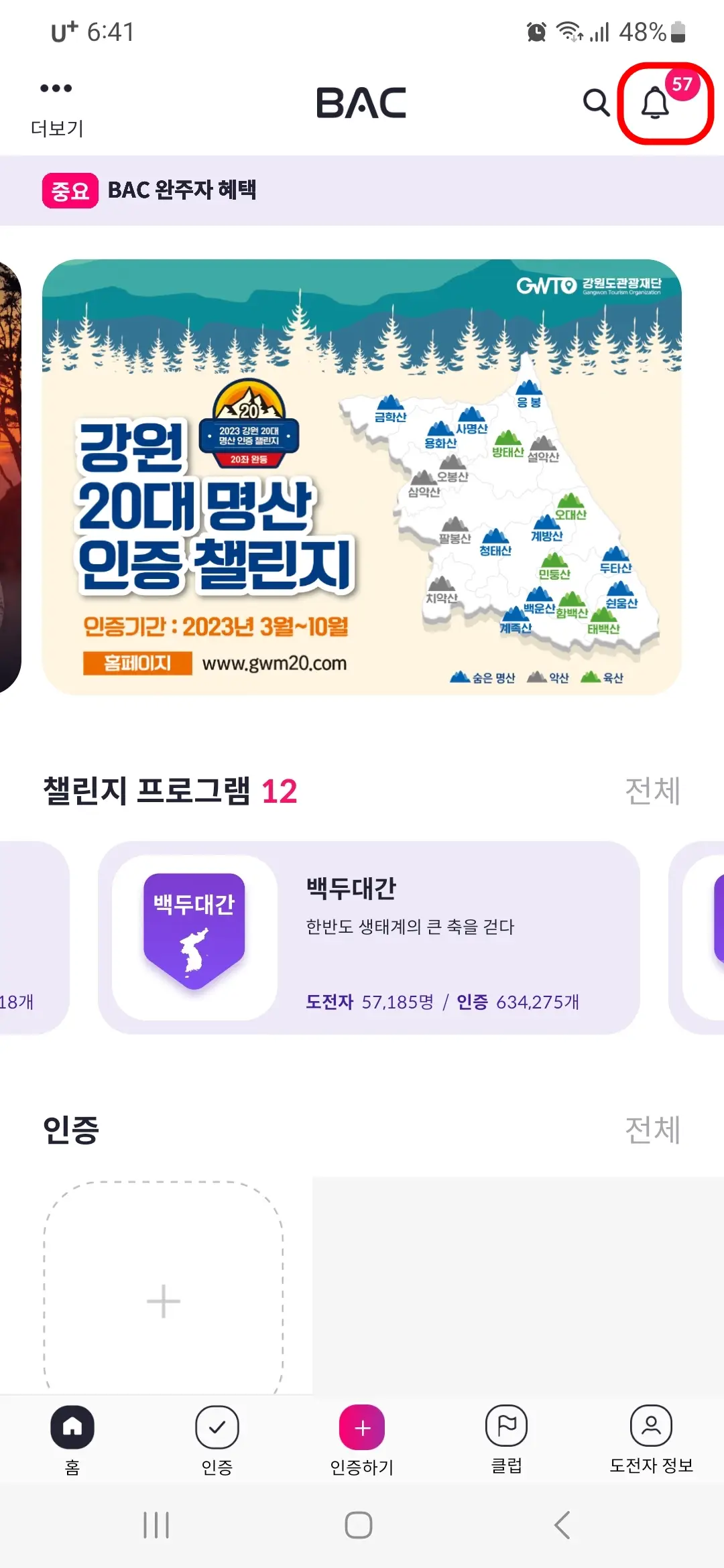 3. 알림이 확인되면 블랙야크 알파인 클럽 홈 화면과 나의 인증에서도 인증이 완료된 것을 확인할 수 있는데요. 홈 화면 아래 인증에서 먼저 확인을 합니다.