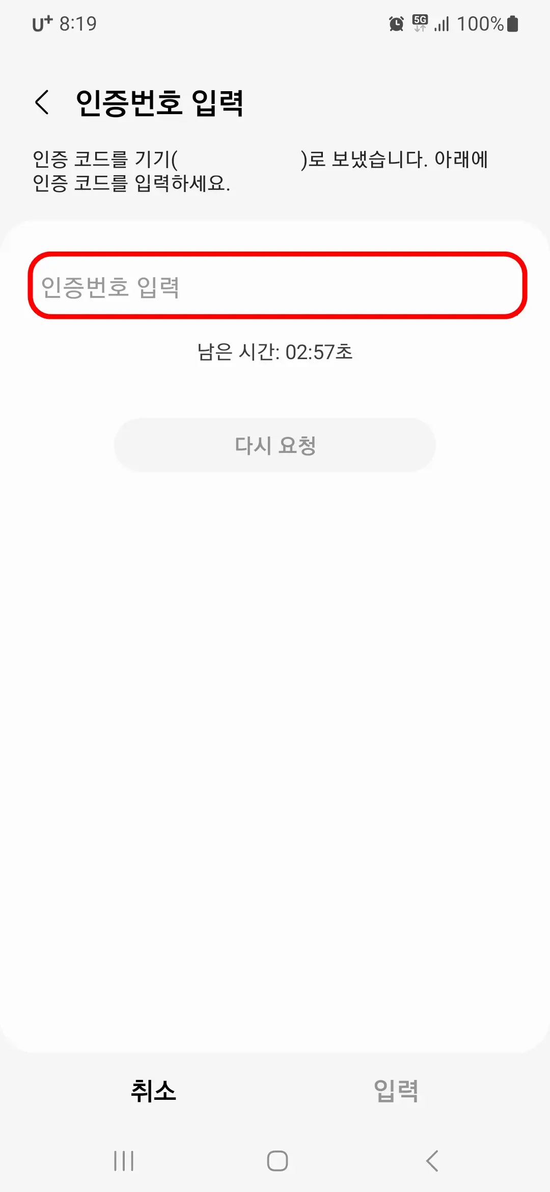 15. 모바일 데이터를 켜고 다시 "인증 요청" 버튼을 누르면 인증번호 입력란으로 넘어갑니다. 인증번호는 자동으로 입력이 되네요.