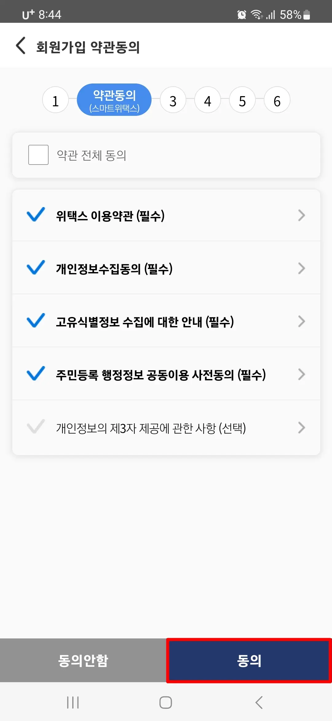 3. 회원가입을 위한 약관동의란인데요. 필수 약관동의(스마트위택스)에 체크를 하고 "동의" 버튼을 누릅니다.