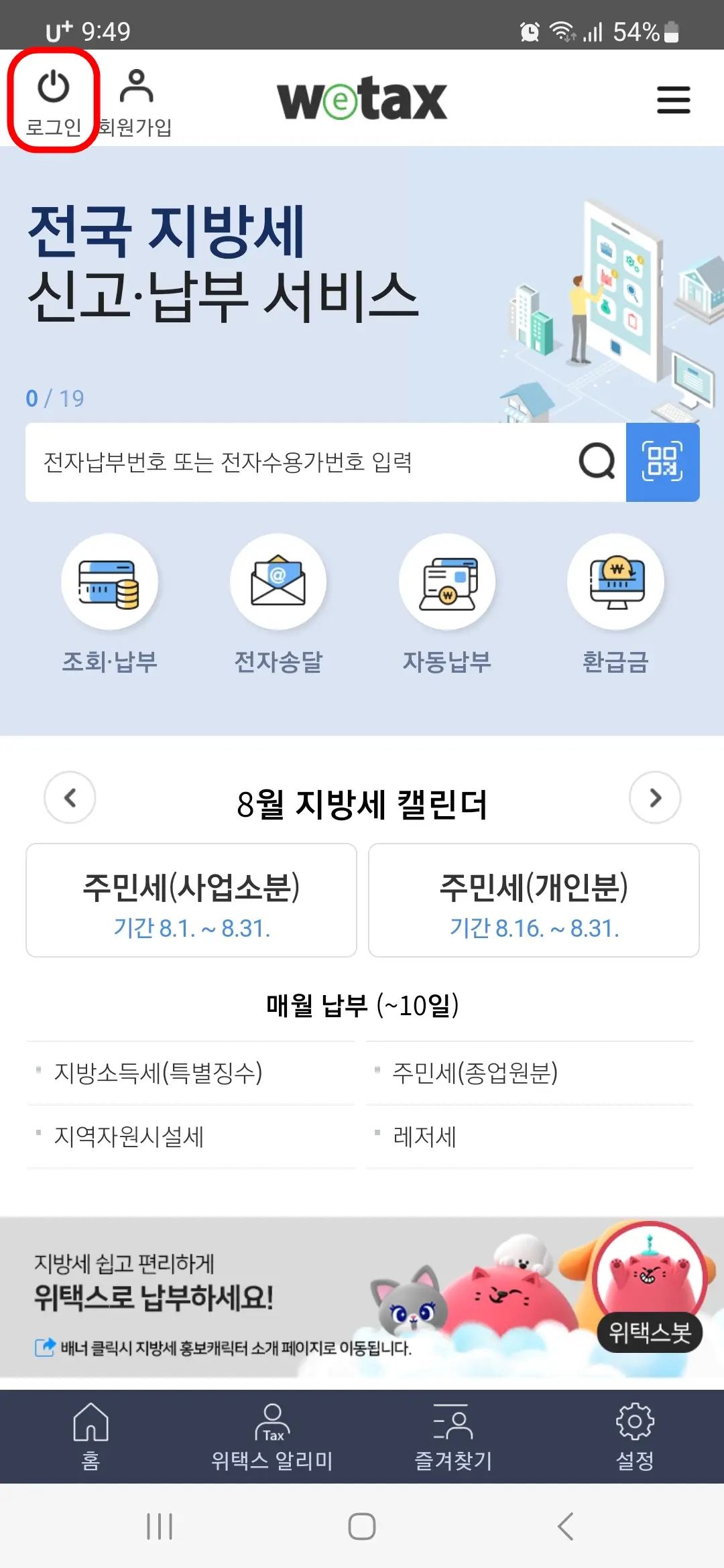 스마트 위택스(Wetax) 앱은 모바일 기기(스마트폰)에서 지방세·세입수입을 조회, 납부할 수 있는 서비스를 제공하고 있는데요. 간편 인증 · 공동인증서 · 금융인증서 · 디지털원패스로 로그인이 가능하며 비회원도 「전자납부번호로 조회」 메뉴를 실행하여 고지서상의 전자납부번호를 입력하시면 해당 건에 대해서 납부하실 수 있습니다.