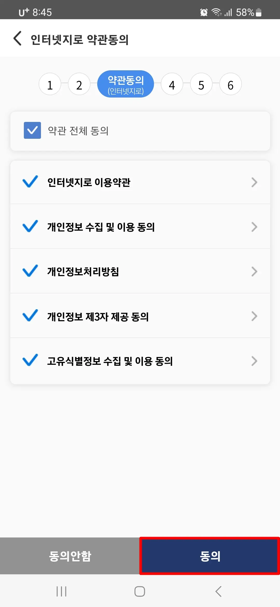 4. 인터넷지로 약관동의입니다. 약관 전체 동의에 체크를 하고 "동의" 버튼을 누릅니다.