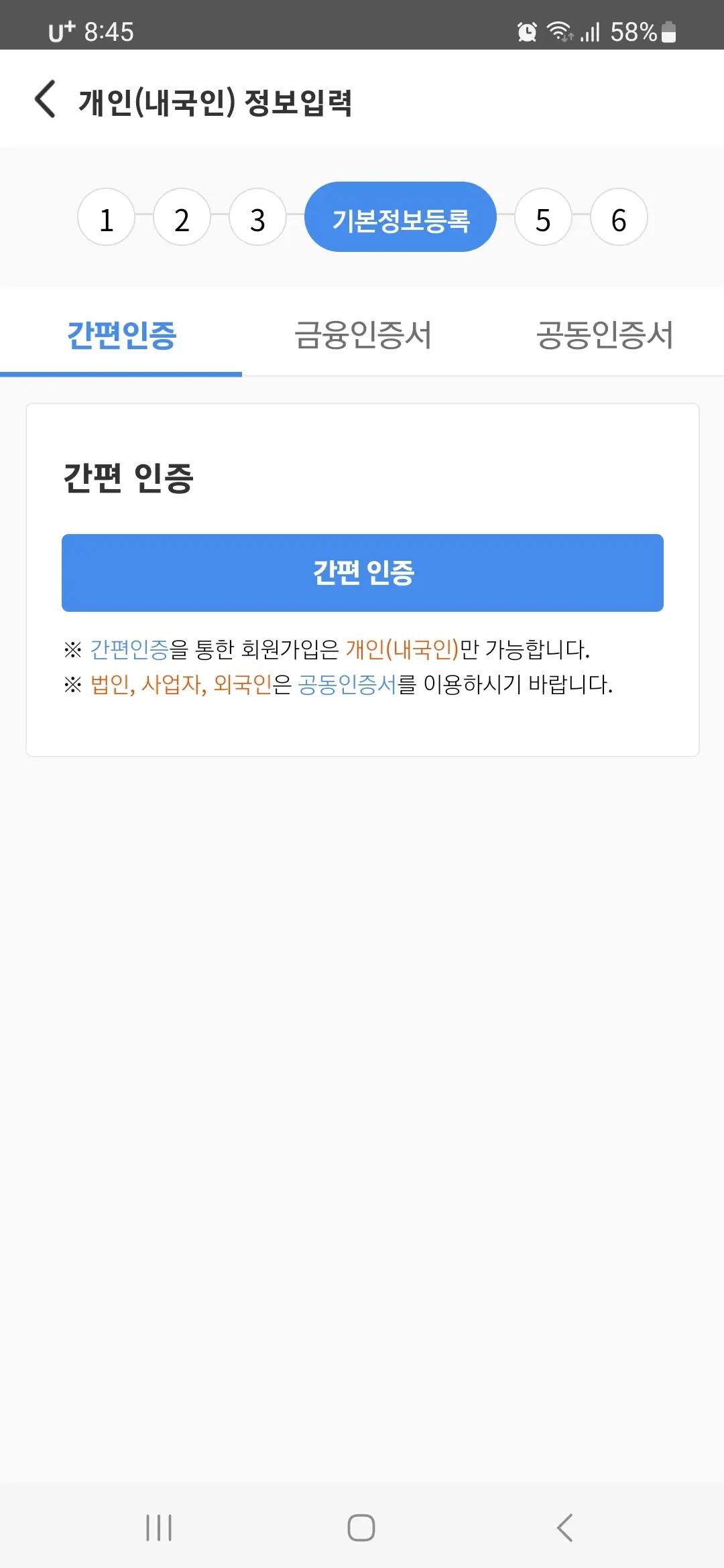 5. 개인(내국인) 정보입력 과정인데요. 간편 인증, 금융인증서, 공동인증서 중 선택할 수 있습니다.