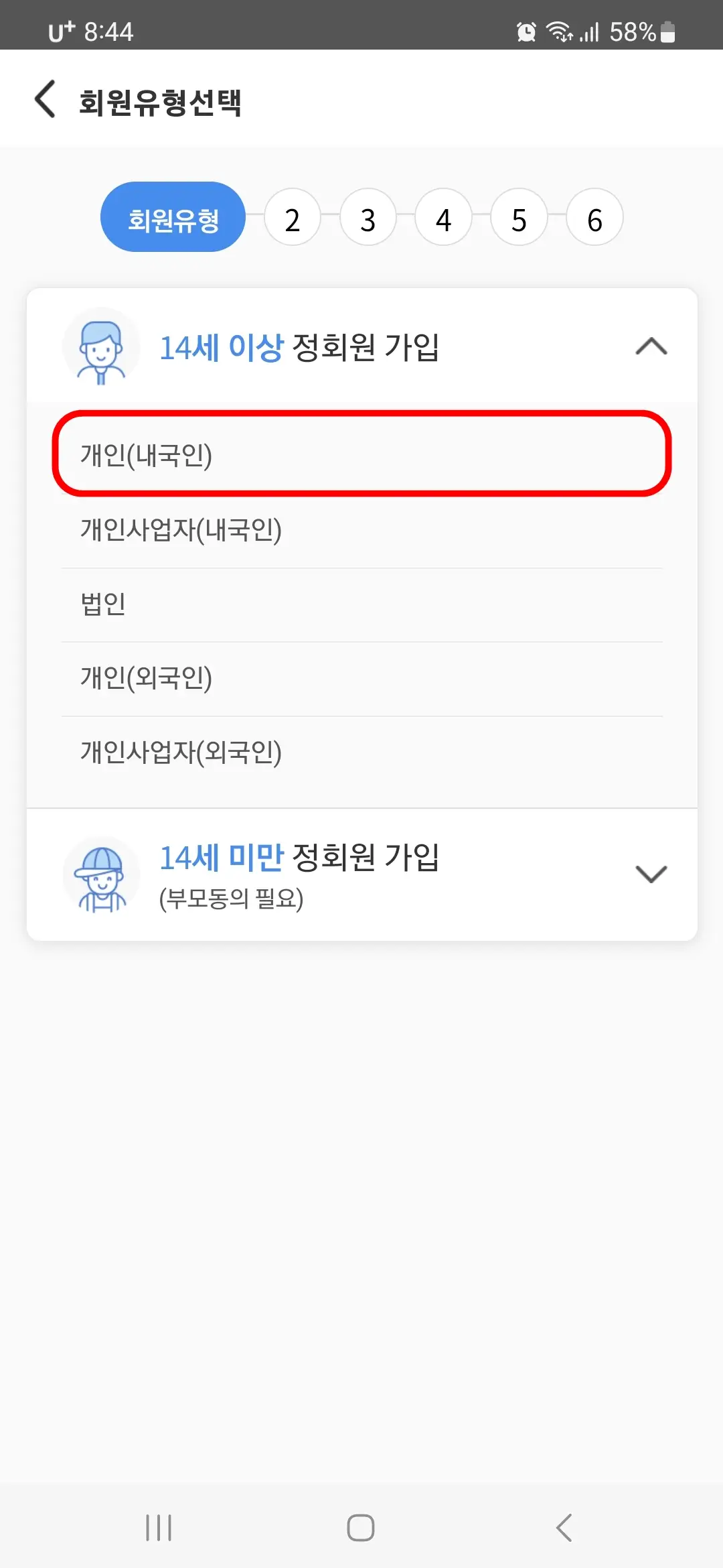 2. 회원유형선택 화면입니다. 14세 이상 정회원 가입과 14세 미만 정회원 가입(부모동의 필요)으로 나뉘는데요. "개인(내국인)"을 선택합니다.