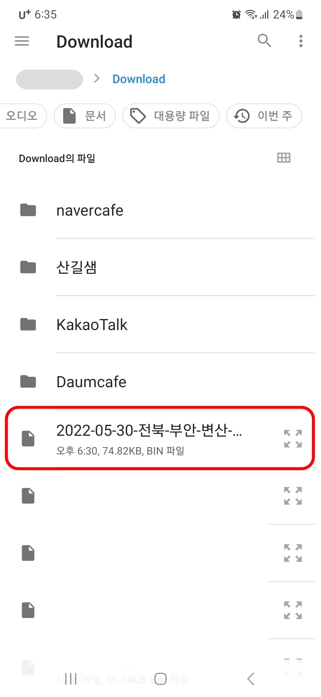 4. 안드로이드 11 버전 이상에서는 가져오기를 하면 시스템에서 제공하는 선택 도구가 구동되는데요. 다운로드 폴더의 가져오기 할 gpx 파일을 누릅니다. 참고로 일반적으로 다운로드한 파일은 Download 폴더, 네이버카페에서 받은 파일은 Download/navercafe 폴더, 다음 카페에 받은 파일은 Download/Daumcafe 폴더에 저장이 됩니다.