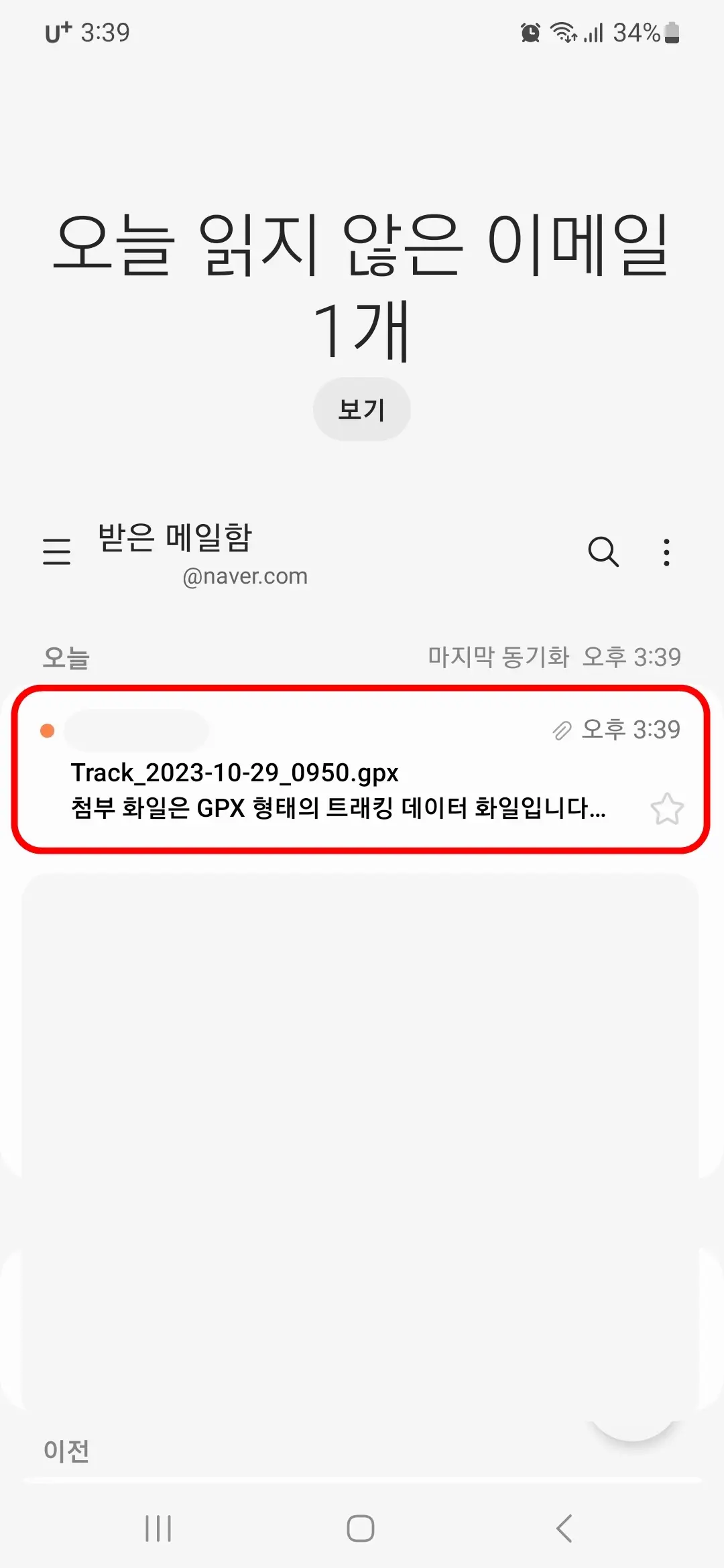 13. 네이버 메일로 내보내기 한 gpx 파일도 전송이 잘 되었습니다.