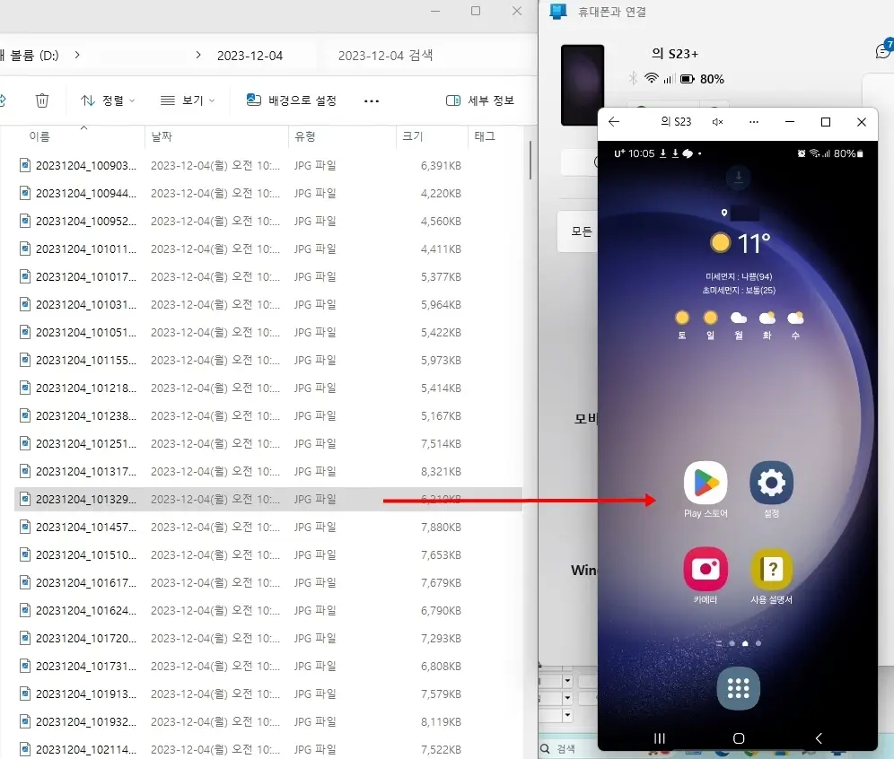 3. PC의 '휴대폰 연결' 앱에 갤럭시 휴대폰의 화면이 띄워졌습니다. PC 윈도우의 파일을 갤럭시 휴대폰의 화면 위로 드래그해서 끌어다 놓으면 전송이 됩니다. 전송된 파일은 내 파일 > 내장 저장공간 > Download 폴더에 저장이 됩니다.