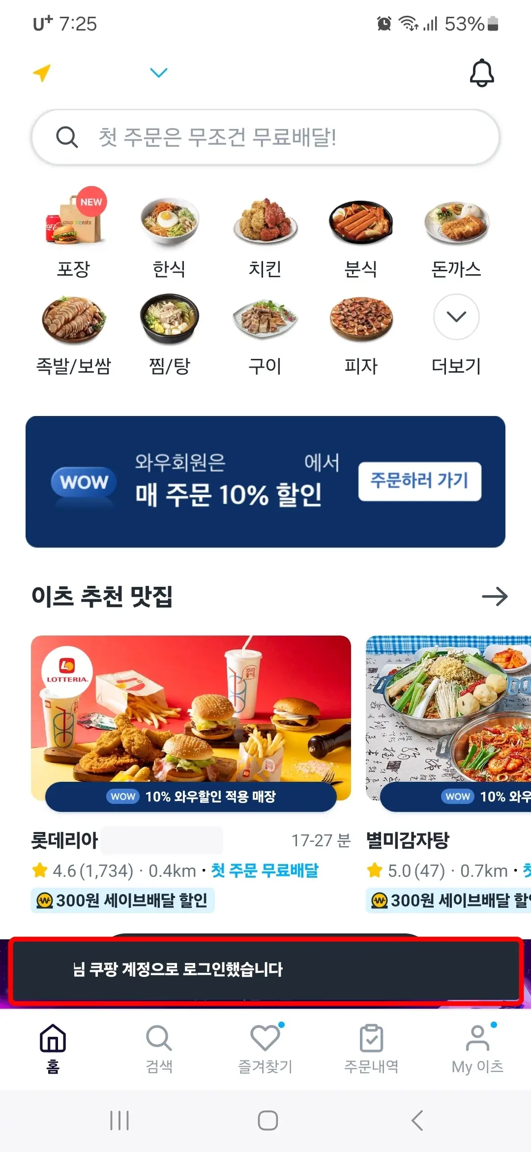 8. 쿠팡이츠 앱 설치 및 위치사용 권한 설정을 마치고 홈화면에 접속합니다.