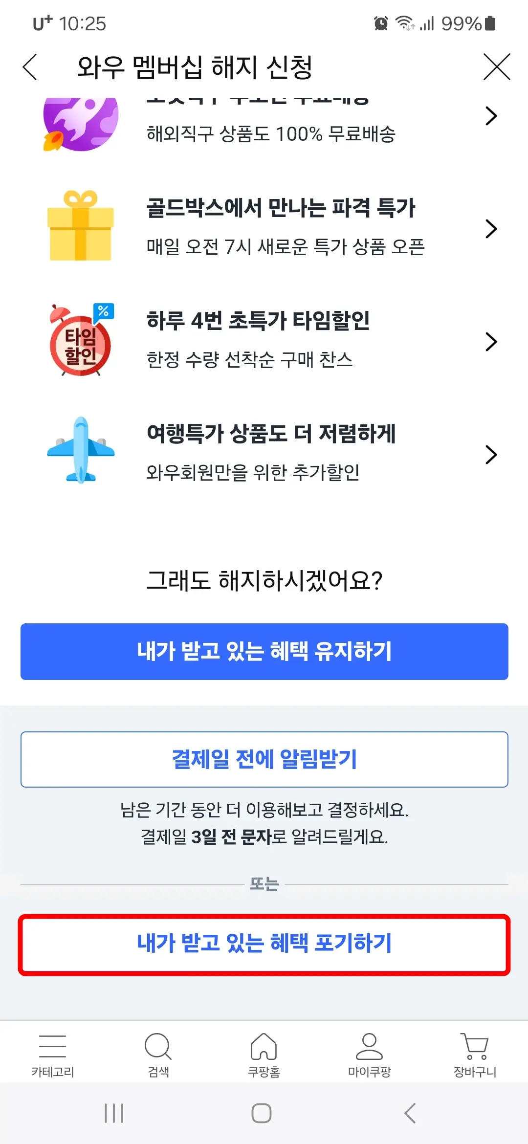 4. 또 아래로 죽 내려 "내가 받고 있는 혜택 포기하기" 버튼을 누르면 바로 해지가 됩니다. 선택은 3가지인데요. 계속 이용하시려면 "내가 받고 있는 혜택 유지하기"를 선택하시고, 결제일 3일 전에 문자 알림을 받기 원하시면 "결제일 전에 알림받기" 버튼을 누르셔도 됩니다.
