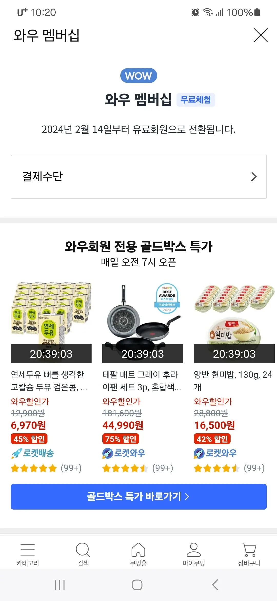 9. '마이쿠팡'의 '와우 멤버십'으로 들어가면 와우 멤버십 무료체험기간 중임을 알리고 있고 2024년 2월 14일부터 유료회원으로 전환된다고 알려주고 있습니다.