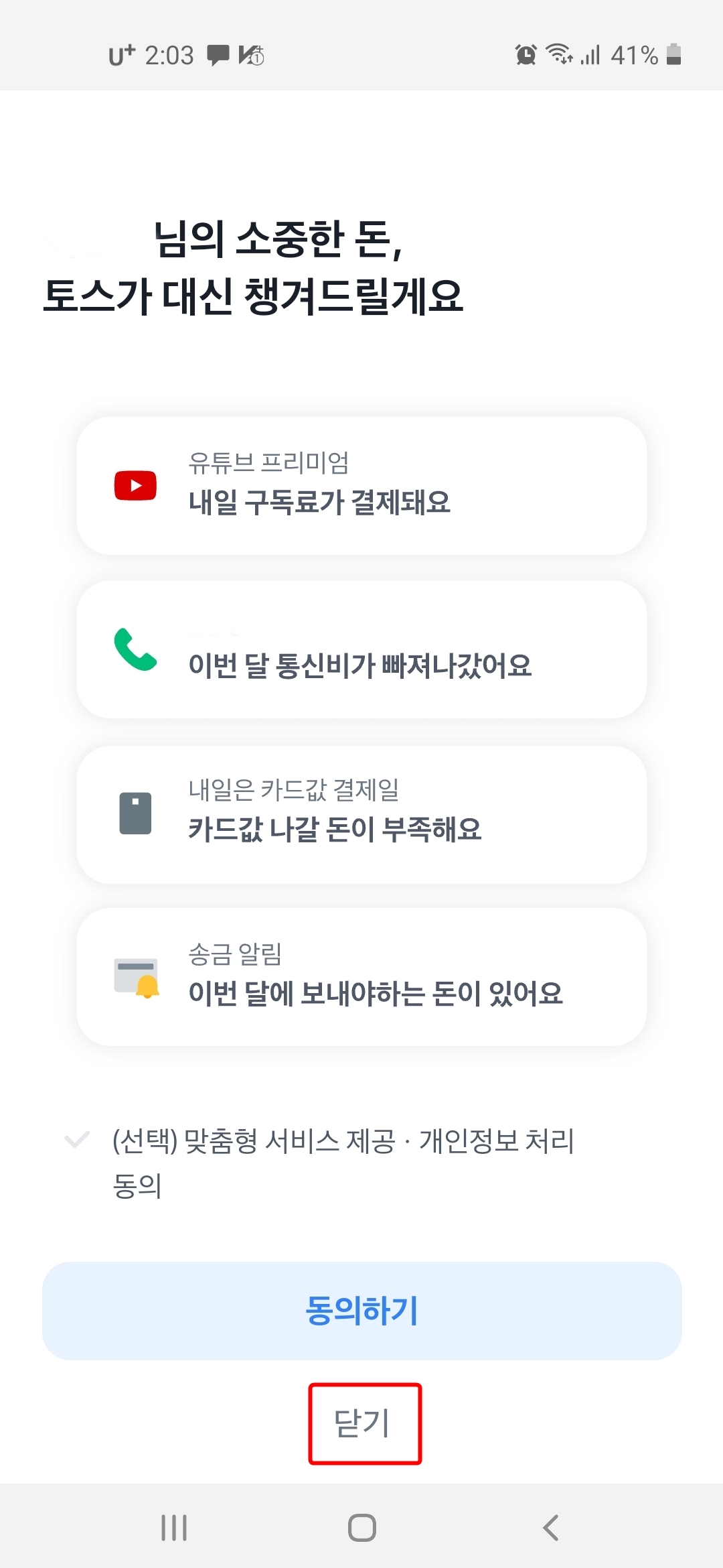 15. '토스가 챙겨드릴게요' 화면에서는 저는 '닫기' 버튼을 눌렀습니다.