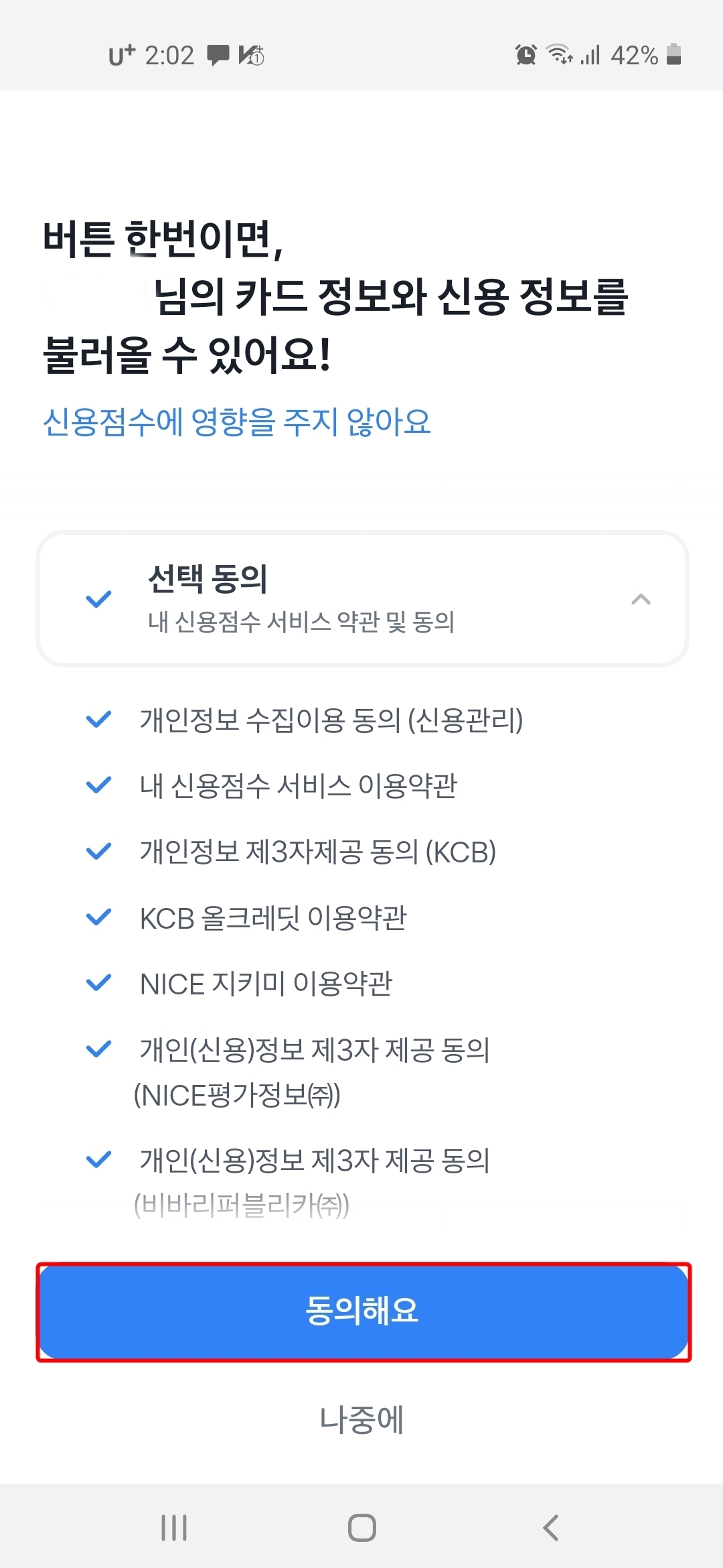 14. 내 신용점수 서비스 약관 및 동의에 저는 동의하기 버튼을 눌렀습니다. 나중에 하셔도 됩니다.