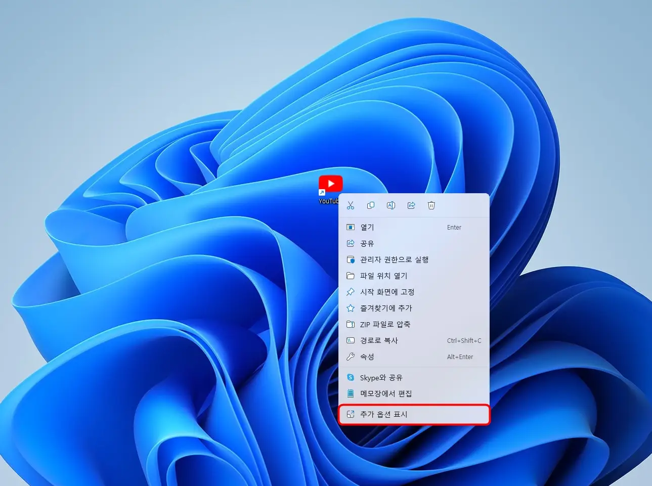 6. 유튜브 바로가기 아이콘에 오른쪽 마우스 버튼을 누른 후 "추가 옵션 보기" 버튼을 클릭합니다.