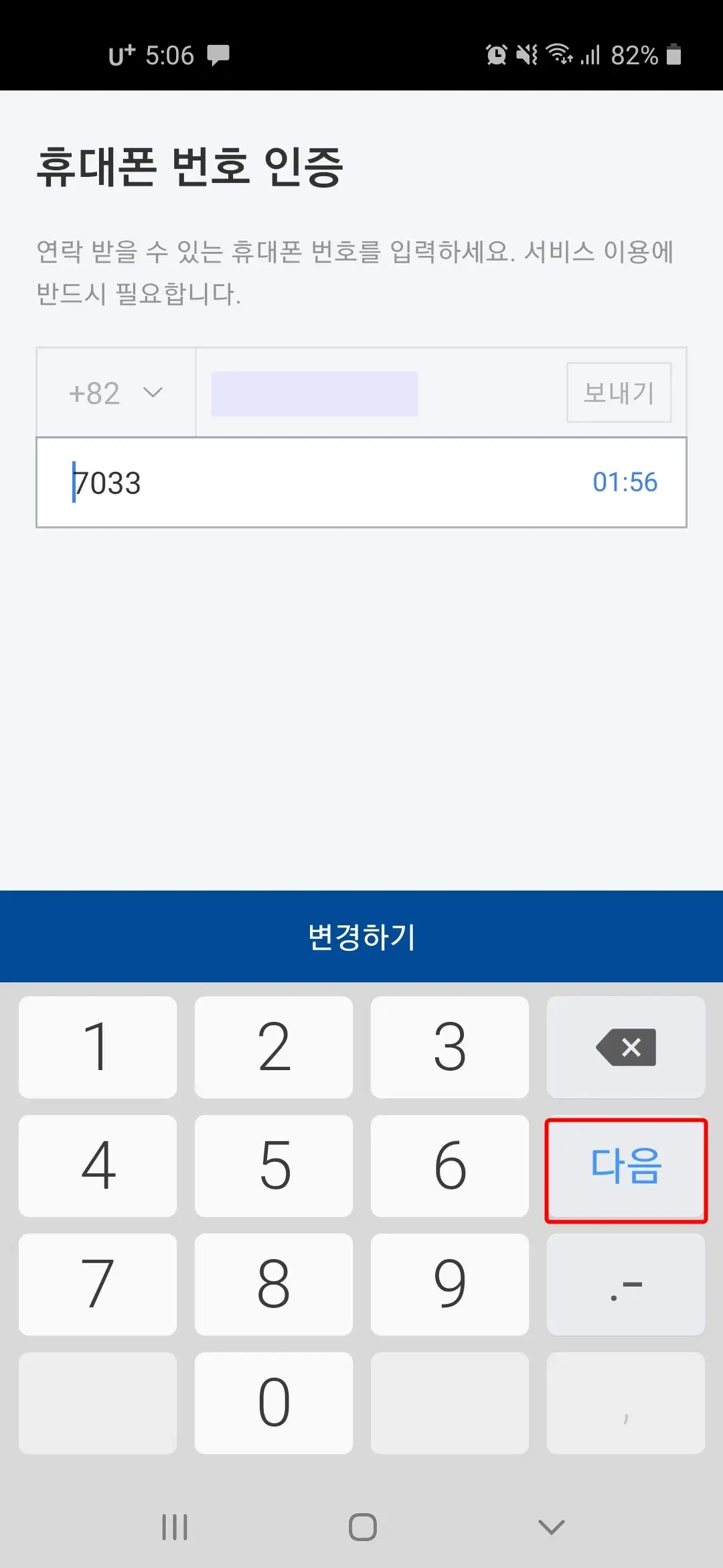 2. 휴대폰으로 문자가 전송이 되면 자동으로 인증번호가 입력이 됩니다. '다음' 버튼을 누릅니다.
