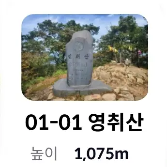 | 1 | 01-01 영취산 | 정상석 | 1,075 | 전북 장수군 번암면 지지리 / 경남 함양군 서상면 옥산리 | ||