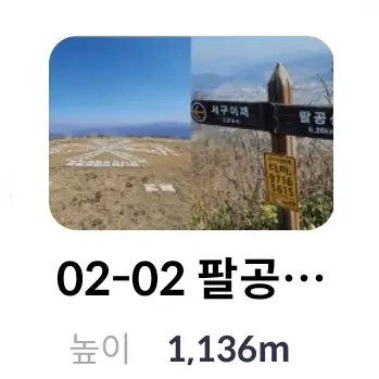 | 5 | 02-02 팔공산 헬기장 | 헬기장, 표지 | 1,136 | 전북 장수군 장수읍 용계리 / 전북 진안군 백운면 신암리 | ||