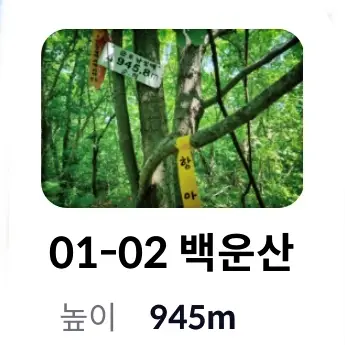 | 2 | 01-02 백운산 | 945.8 산패 | 945 | 전북 장수군 장수읍 덕산리 | ||