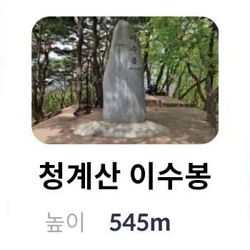 | 3 | 청계산 이수봉 | 청계산 이수봉 | 545m | 경기도 성남시 수정구 금토동 | |