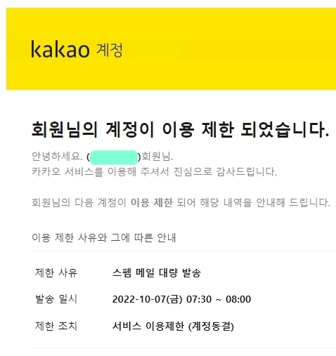 2. 메일을 열어보니 카카오 계정이 이용 제한되었습니다. 제한 사유는 스팸 메일 대량 발송이고, 발송일시는 22-10-07(금) 07:30 ~ 08:00로, 제한조치는 서비스 이용제한 (계정 동결)로 안내 되어 있었는데요. 아래 주의사항에는 회원님의 활동이 아니라면 아래의 버튼을 눌러 제한 조치를 해제하세요. 30일 이내에 해제확인이 없을 경우 이용제한 대상은 별도 통보없이 30일 뒤 영구 삭제 / 폐쇄됩니다. '제한 해제하기' 버튼을 클릭하도록 교묘하게 유도하고 있습니다. '제한 해제하기' 버튼을 클릭하면 카카오 로그인 화면으로 이동하게 되는데요. 로그인 화면에서 패스워드를 입력하게 되면 자연스럽게 해커에게 자신의 계정이 노출이 되겠죠. 뭔가 이상하다 싶어 메일을 보낸 사람이 누구인지 다시 확인했습니다.
