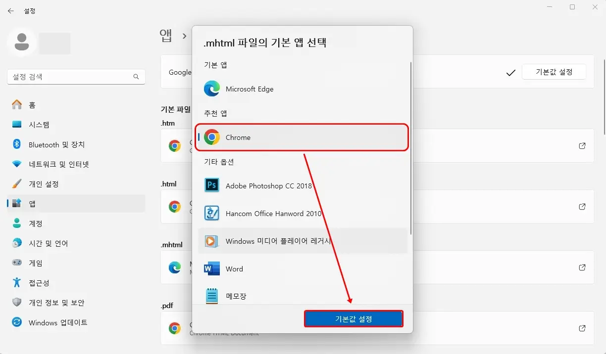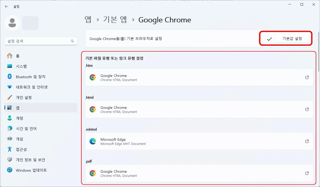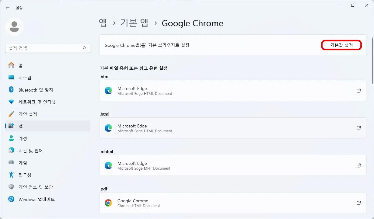 6. "기본 파일 유형 및 링크 유형 설정" 중 구글 크롬으로 변경이 안 되는 항목은 클릭하여 크롬 앱을 선택하고 "기본값 설정" 버튼을 눌러주세요.