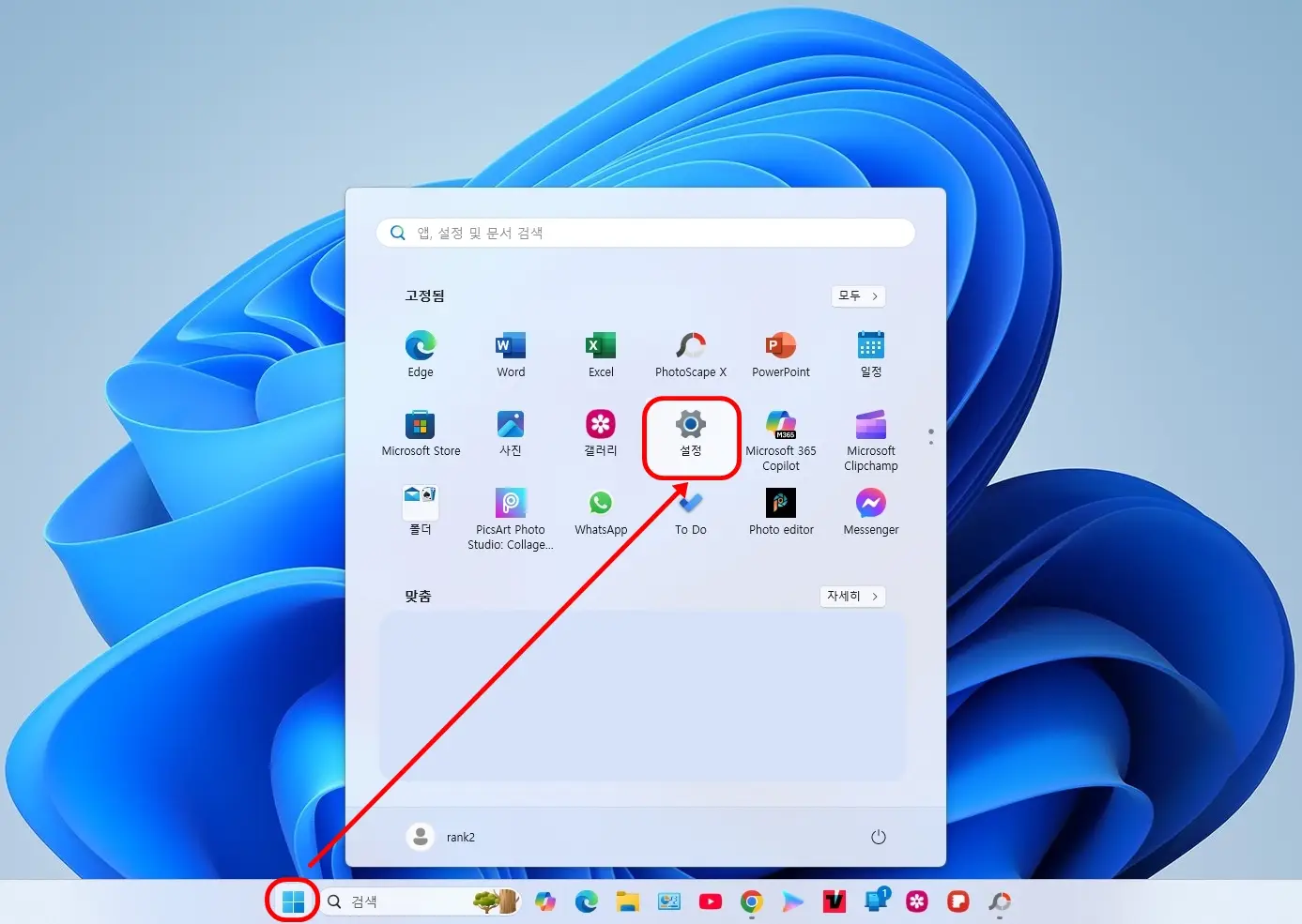 1. 윈도우 11 작업표시줄의 "시작" 버튼을 클릭 후 "설정" 아이콘을 클릭합니다. 또는 키보드의 "윈도우키+i"를 동시에 눌러도 됩니다.