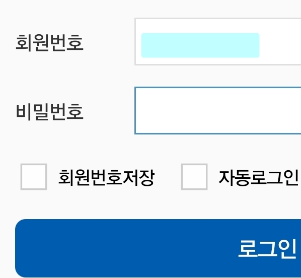 10. 로그인 화면으로 넘어왔는데요. 회원번호가 자동으로 입력이 되어 있고 비밀번호만 입력하면 '로그인'이 가능합니다.