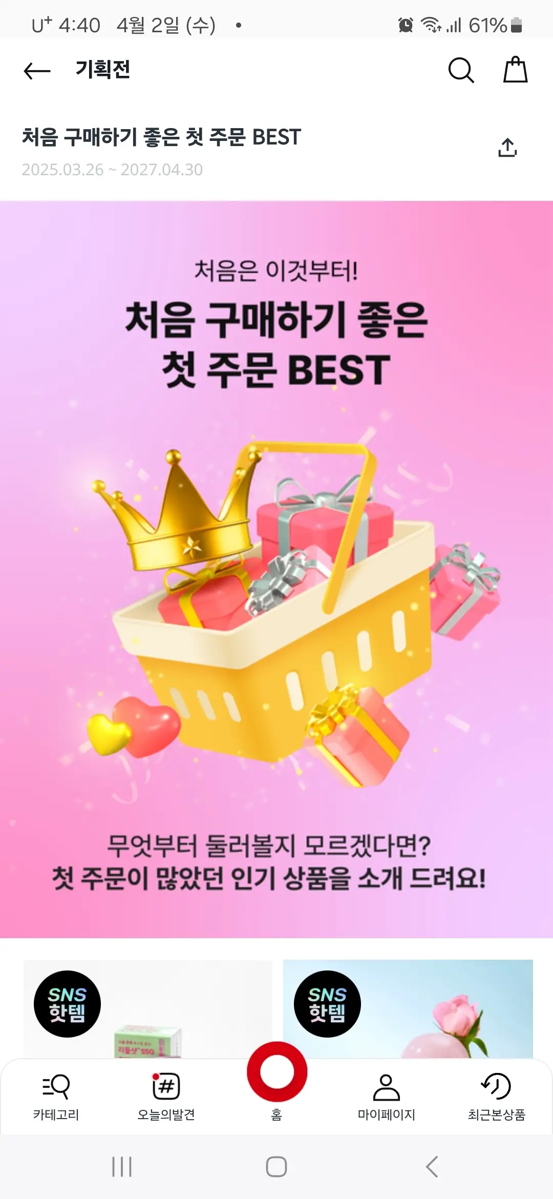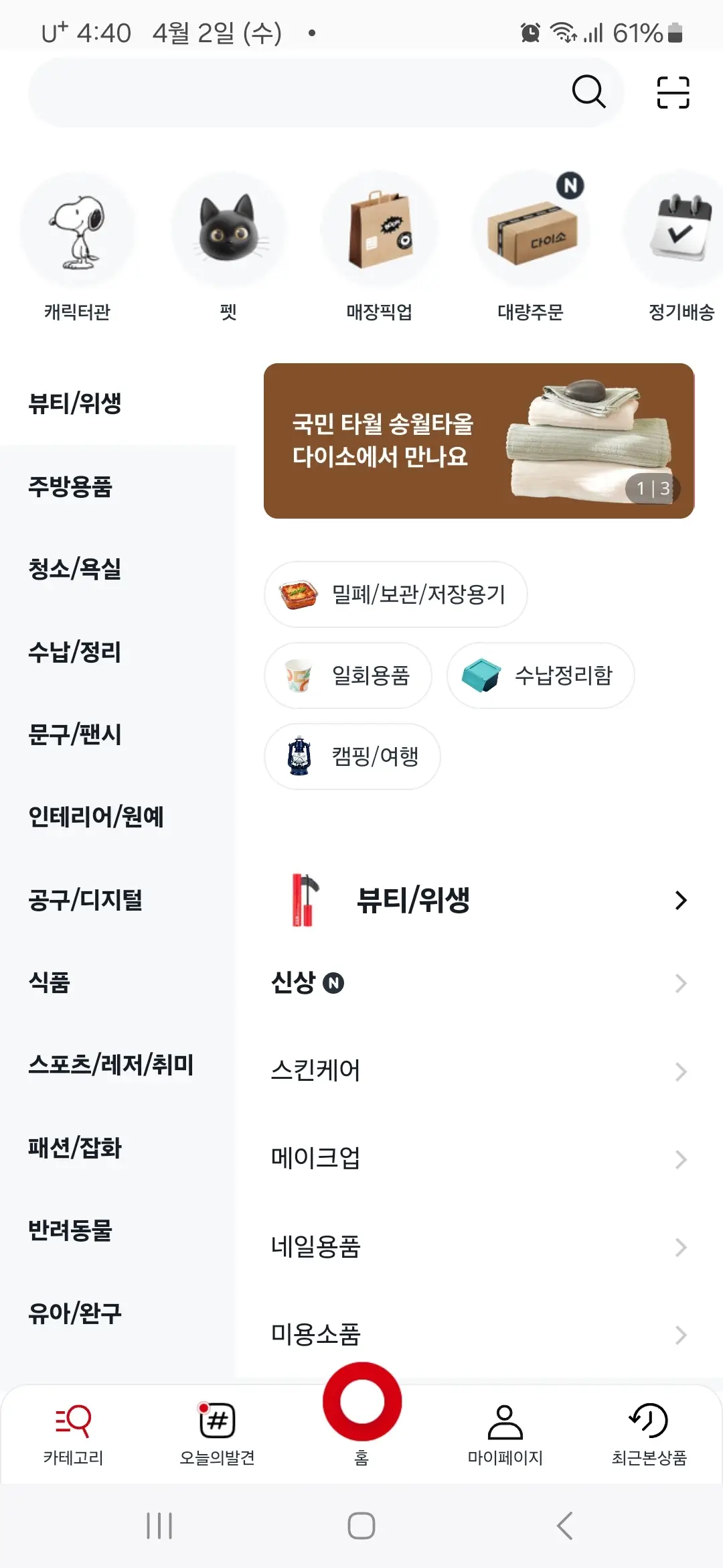 2) 오늘의발견 : 추천, NOW, 에디터PICK, 위클리 다이소, DIY