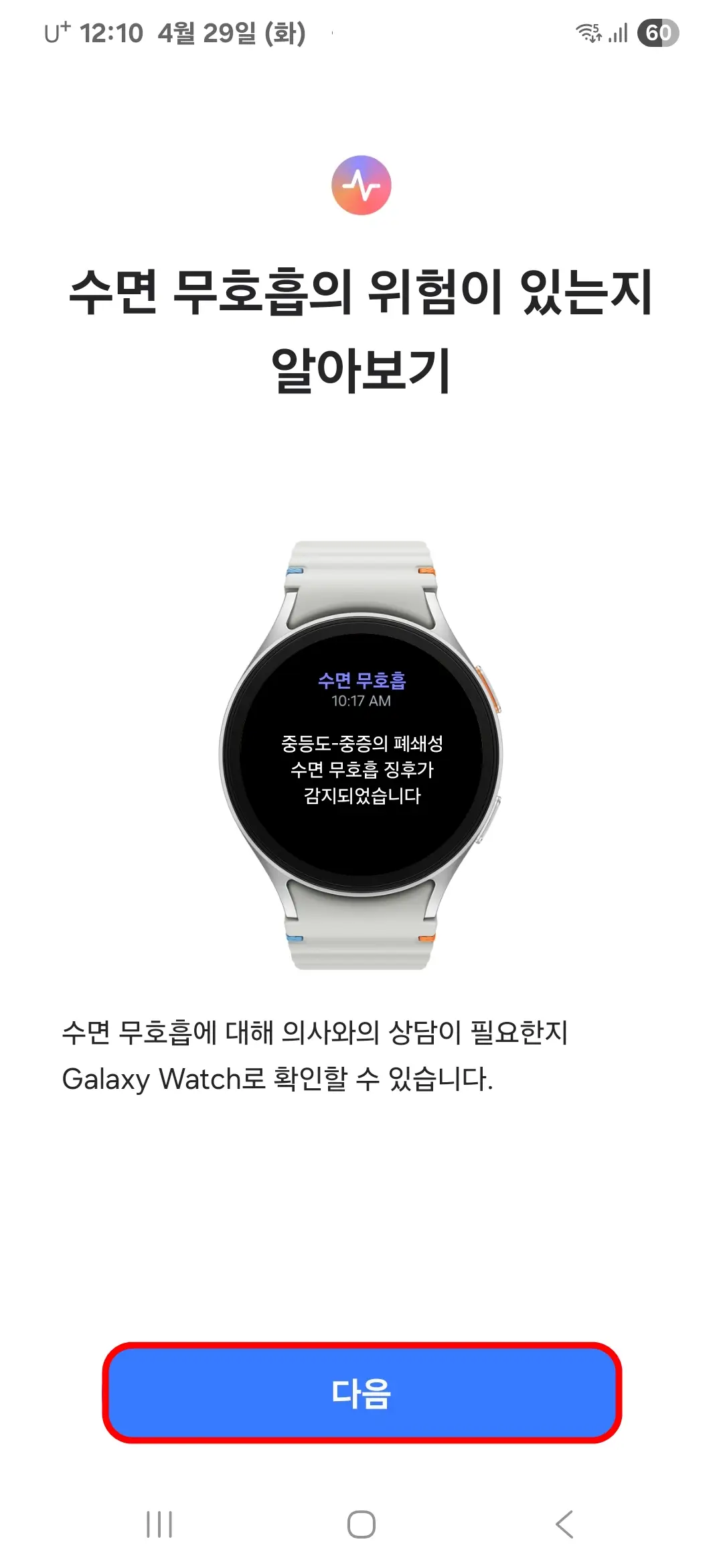 - 수면 무호흡에 대해 의사와의 상담이 필요한지 Galaxy Watch로 확인할 수 있습니다.