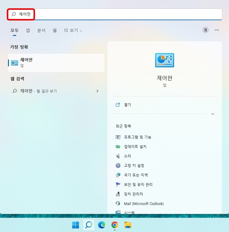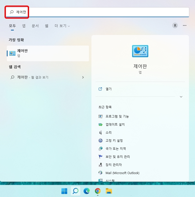 2. 검색창에 '제어판'을 입력하고 엔터 키를 누르면 제어판이 실행이 됩니다.