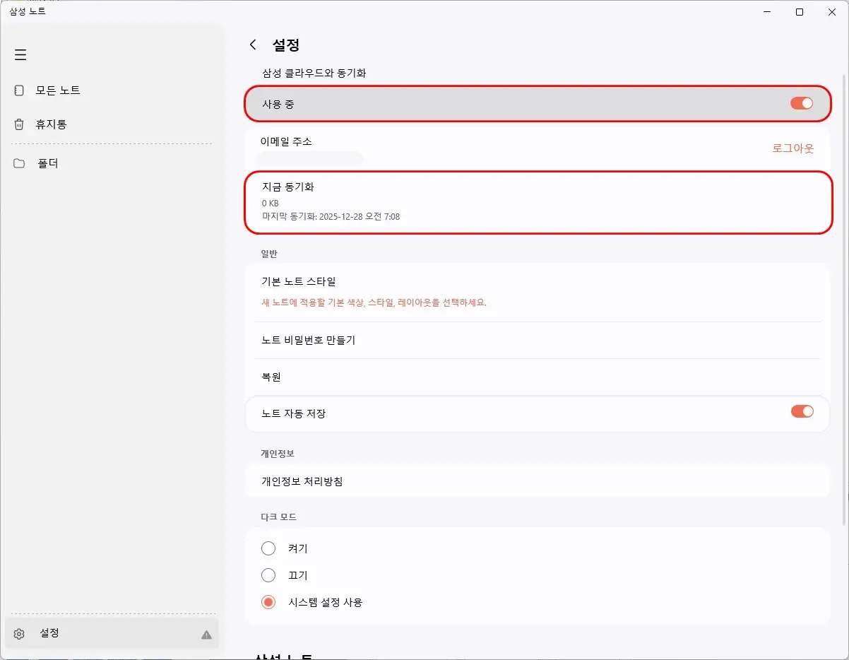 7. 삼성 노트 PC 버전으로 돌아와서 "지금 동기화" 버튼을 클릭합니다.