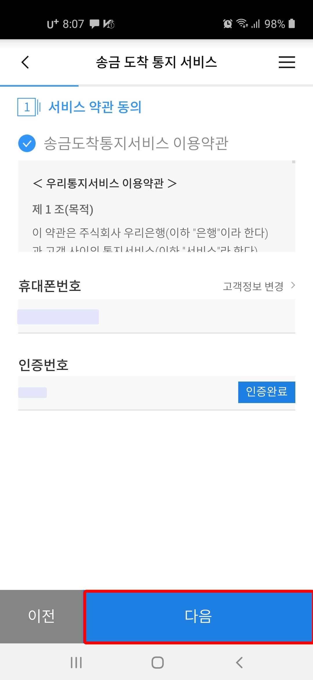 7. 인증이 완료되면 '다음' 버튼을 누릅니다.