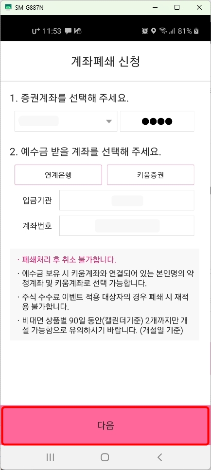 6. 증권계좌와 비밀번호를 입력하고 예수금을 받을 계좌를 선택 후 '다음' 버튼을 누릅니다.